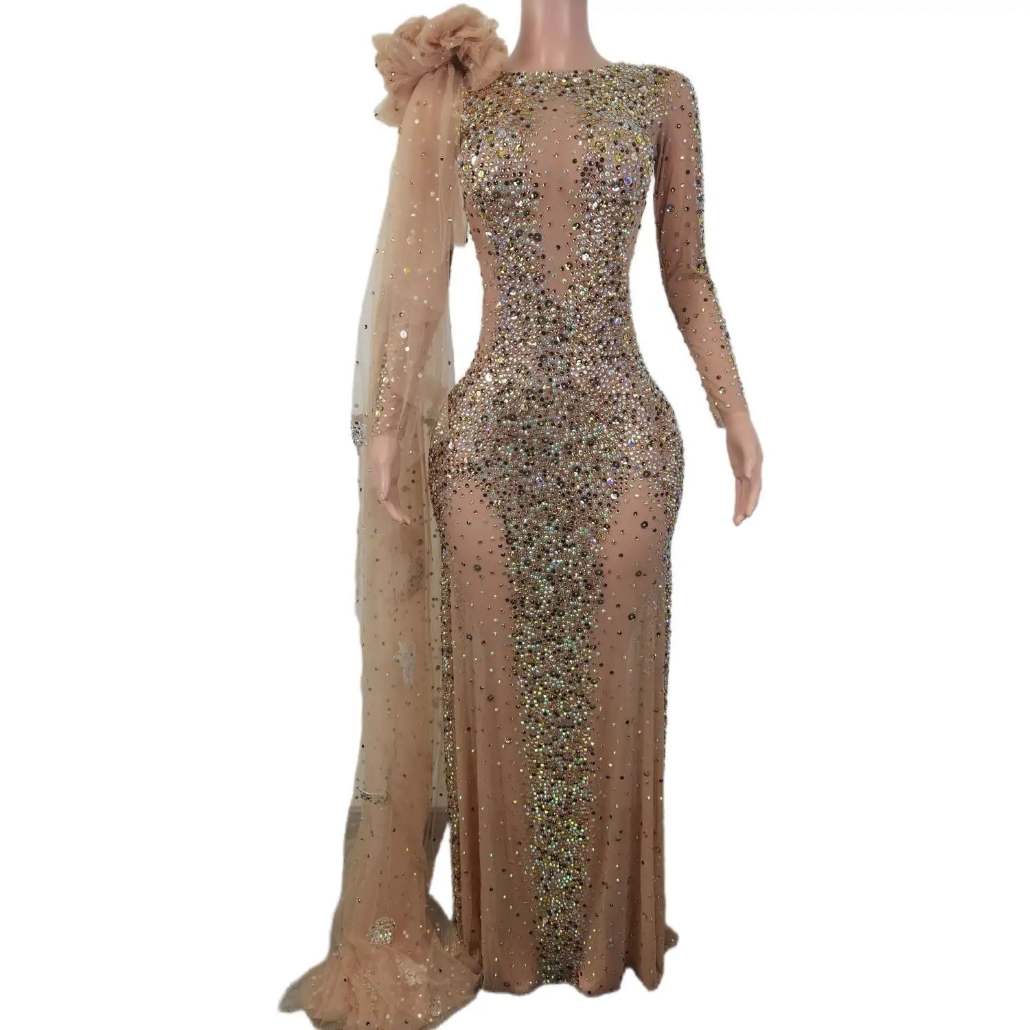 Luxury See Through Mesh Crystals Maxi Birthday Wedding Dress Ladies Bodycon Formal Prom Evening Dress