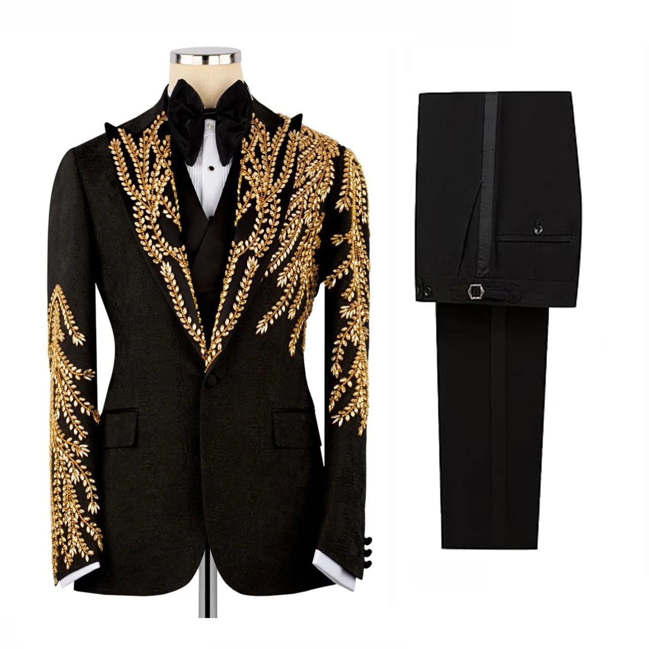 Luxury Beads Men Suits 2 Piece Peaked Lapel Single Breasted Wedding Groom Tuxedos Slim Fit Formal Prom Blazer Custom Made