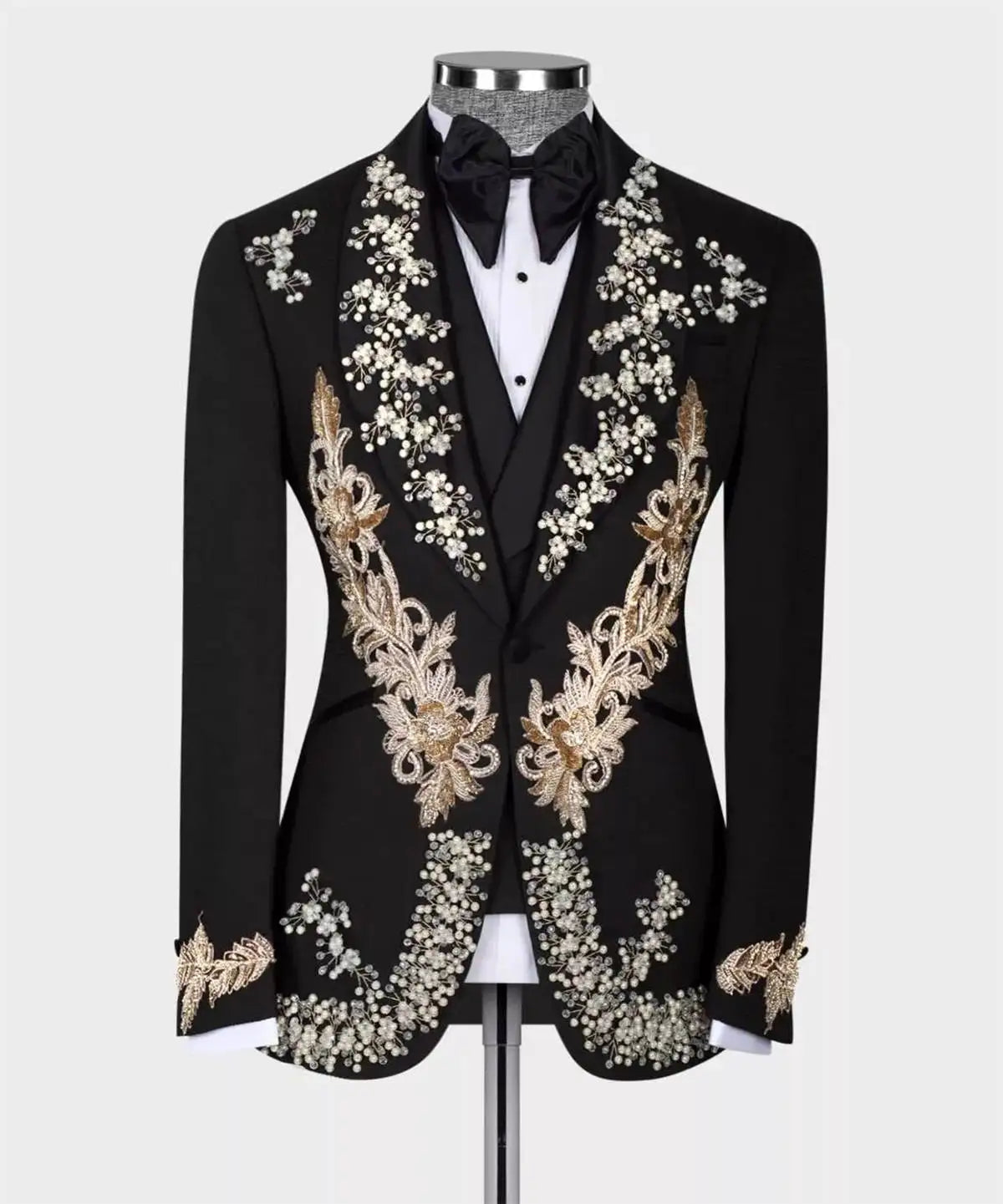 Elegant Men Suit 3 Piece Appliques Coat Blazer Suit Slim Formal Wedding Tuxedos Groom Business Prom Party Customized
