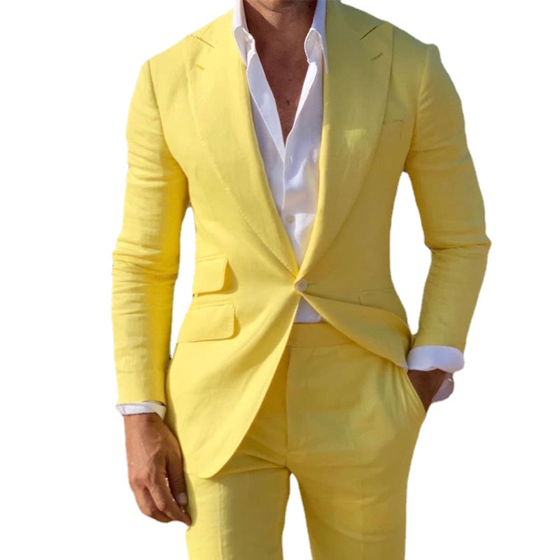 Yellow Linen Beach Men Suits Slim Fit 2 Piece Wedding Groom Tuxedo with Peaked Lapel Costume Blazer with Pants