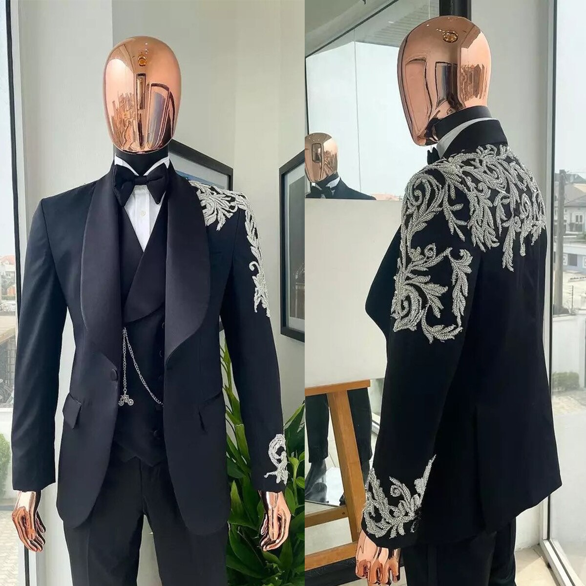 Black Men Suits Tailor-Made 2 Pieces Blazer Pants Single Breasted Diamonds Bead Lapel Gentle Business Wedding Plus Size Tailored