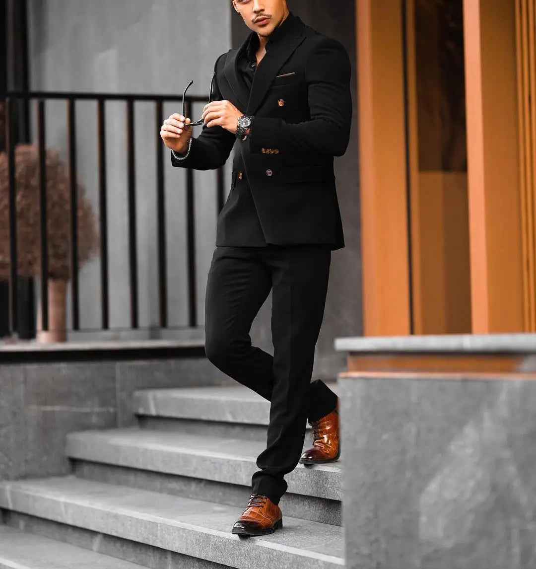 Slim 2 Pieces Blazer Pants Men Suits Double Breasted Peaked Lapel Formal Prom Work Wear Button Wedding Groom Plus Size Tailored