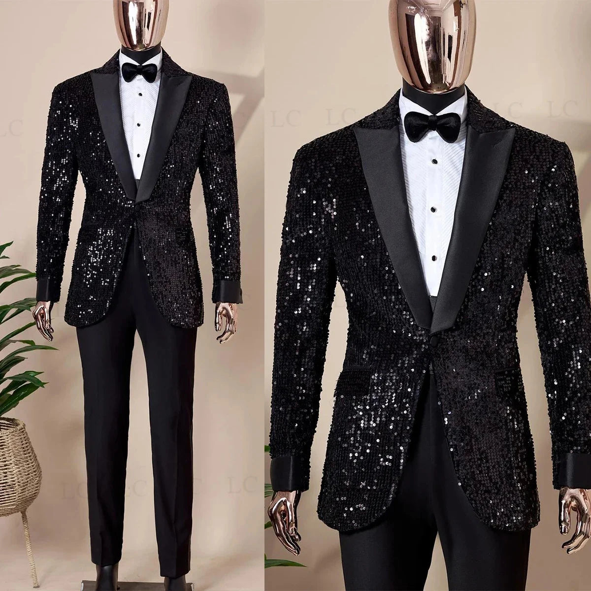 2 Pieces Luxury Sequins Men Suit Blazer Vest One Button Prom Velvet Lapel Tuxedo Sparkly Wedding Groom Plus Size Costume Homme