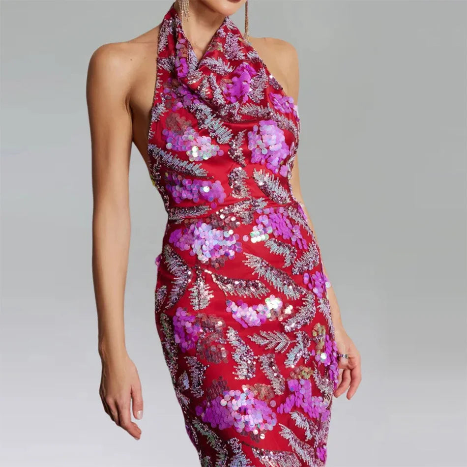Draped Halter Neck Off Shoulder Backless Multicolor Sequin Midi Dress Celebrity Birthday Party Glitter Lady Vestido