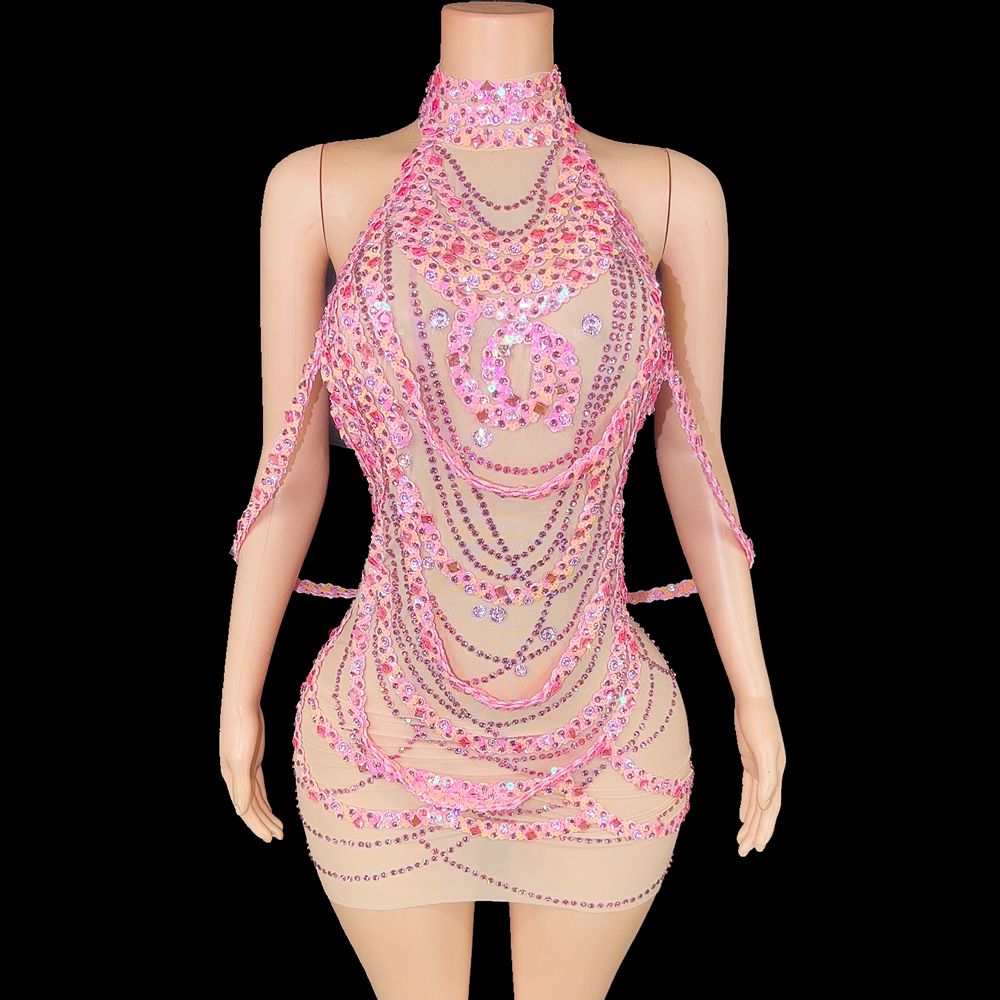 Sparkly Rhinestones Sequins Backless Pink Short Dress Women Sexy Mesh See Through Party Prom Birthday Wedding Dress Show Wear