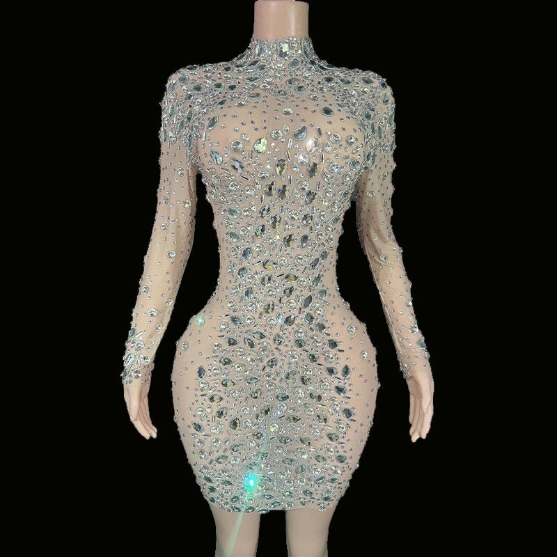 Rhinestones Short Dress Women Evening Prom Party Birthday Outfit Mesh Dance Costume Crystal Dress Show Stage Wear