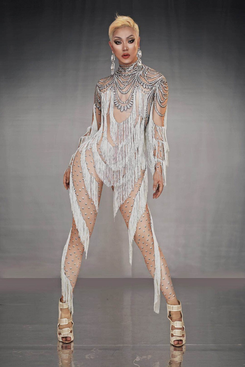 Print Fake Rhinestone White Tassel Long Sleeves Jumpsuit Women Dancer Leggings Romper Singer Stage Performance Show Outfit