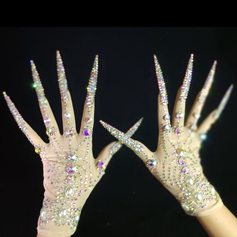 AB Rhinestone Pearls Plus Length Nails Gloves Women Drag Queen Outfit Nightclub Stage Performance Accessories