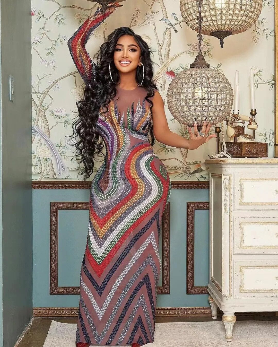 Multi-color Splice Rhinestones Stretch Signal Sleeve Dress Transparent Costume Birthday Party Dress Prom Celebrate Evening Dress