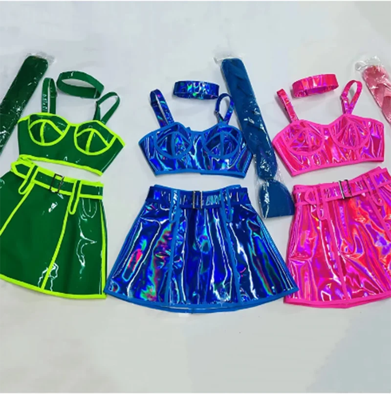 Sexy Fluorescent Laser Tops Skirt Braid Wig Stage Rave Outfit Festival Party Show Performance Clothes Bar DJ Gogo Dance Costume