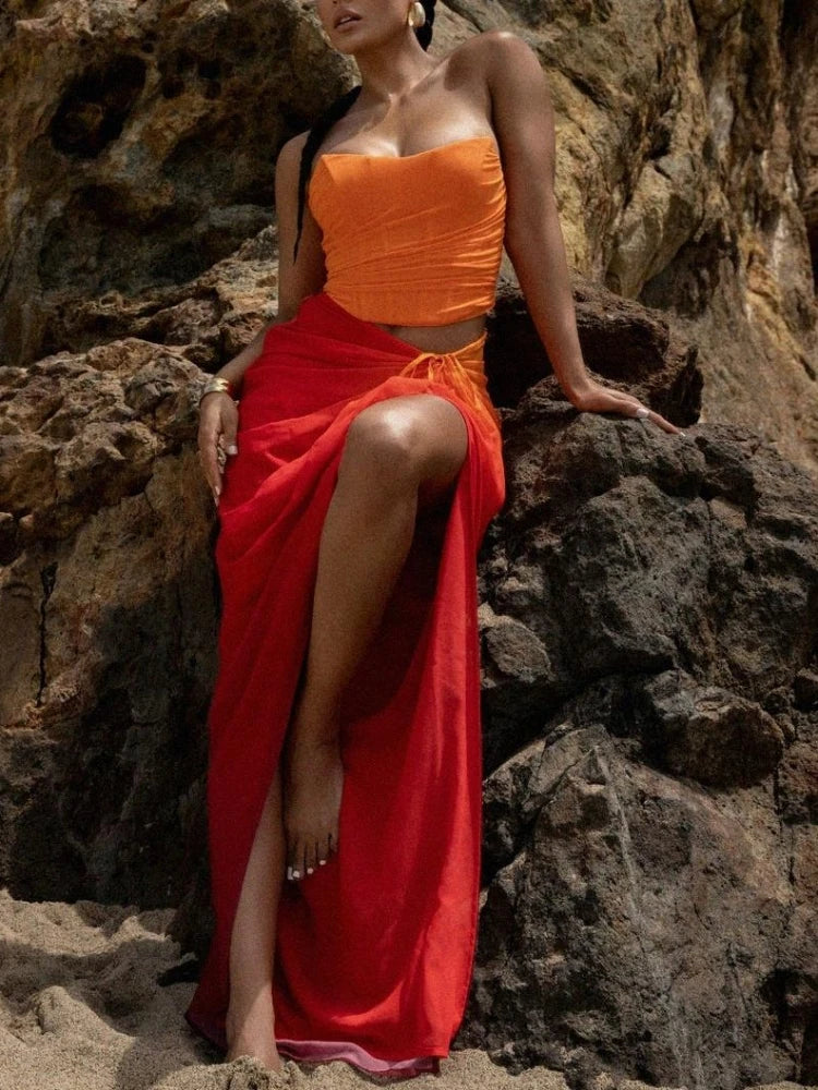 Women Strapless Lace-up Two Piece Set Sexy Short Top + Split Long Skirts Suuts Elegant Beach Party Evening Skirt Sets