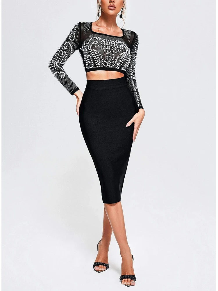 Sexy Black Beading Tops + Bandage Skirt Two Piece Set Women Long Sleeve Mesh Pearl Beading Suits Nightclub Party Evening Outfits