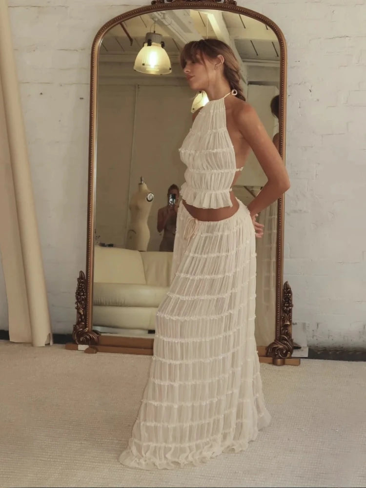 Summer Sexy Sleeveless Backless Top+High Waist Skirt 2 Piece Sets Women See Through Ruffles Skirts Suit Beach Party Holiday Sets