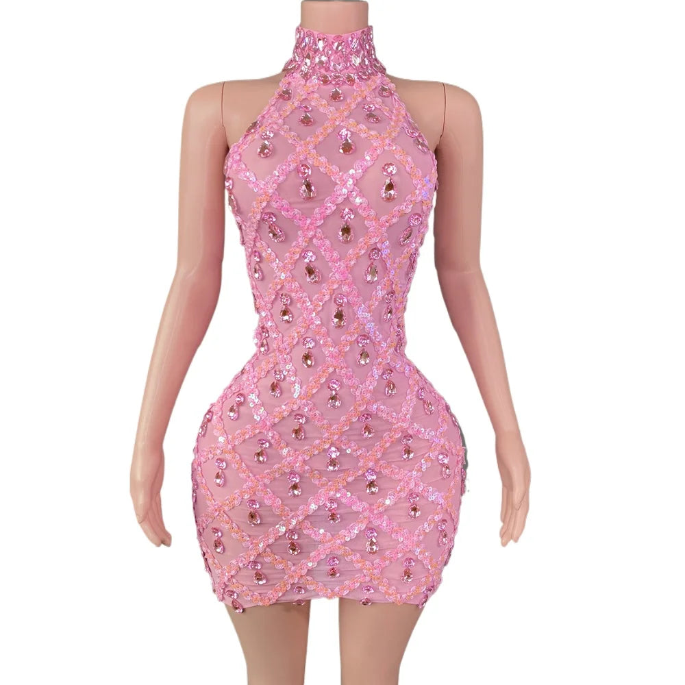 Sparkly Pink Rhinestones Short Dress for Women Sexy Sleeveless Mesh Transparent Evening Prom Birthday Dress Singer Stage Wear