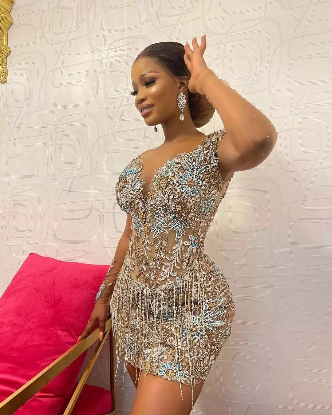 VC Luxury Dress for Women Elegant and Pretty Feathers Sequins Long Sleeves Prom Short Dress