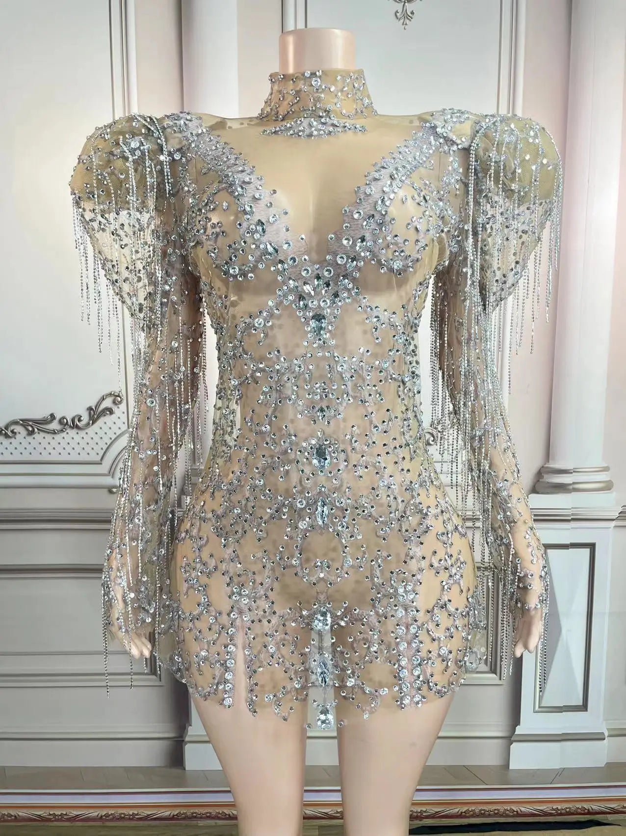 Sparkly Rhinestones Fringes Mesh See Through Short Dress Women Celebrate Birthday Wedding Evening Dress Sexy Show Stage Wear