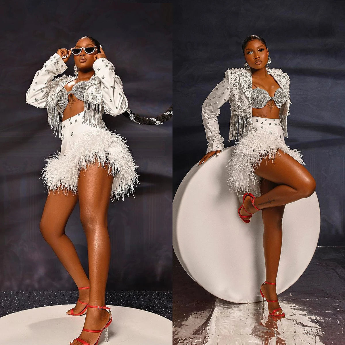 Sexy 2 Pieces Mini Skirt Dresses Exquisite Beads Crystal Feather Tops Party Prom Custom Made Modern Women Suits Sets