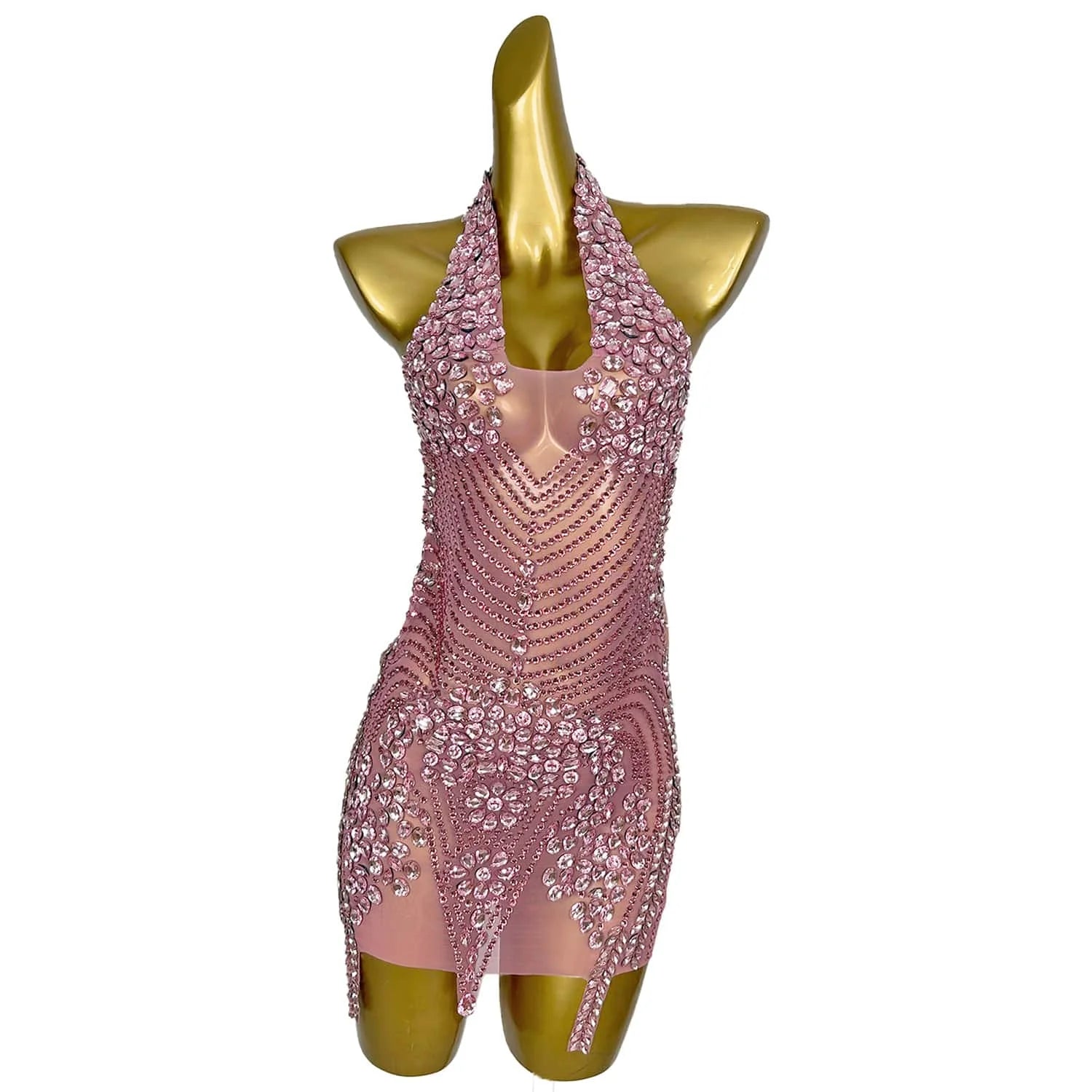 Women Strapless Neck Hanging Dress Pink Diamond Wrapped Skirt Sexy Illusion Banquet Dress Stage Performance Costume