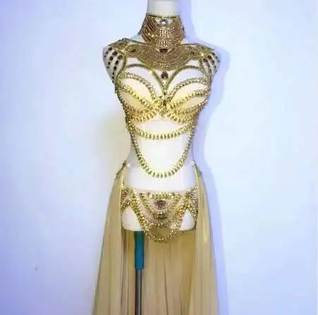 Women's White Red Gold Rhinestones Bikini Long Trailing Skirt Set Singer Host Stage Outfit Model Catwalk Performance Costume