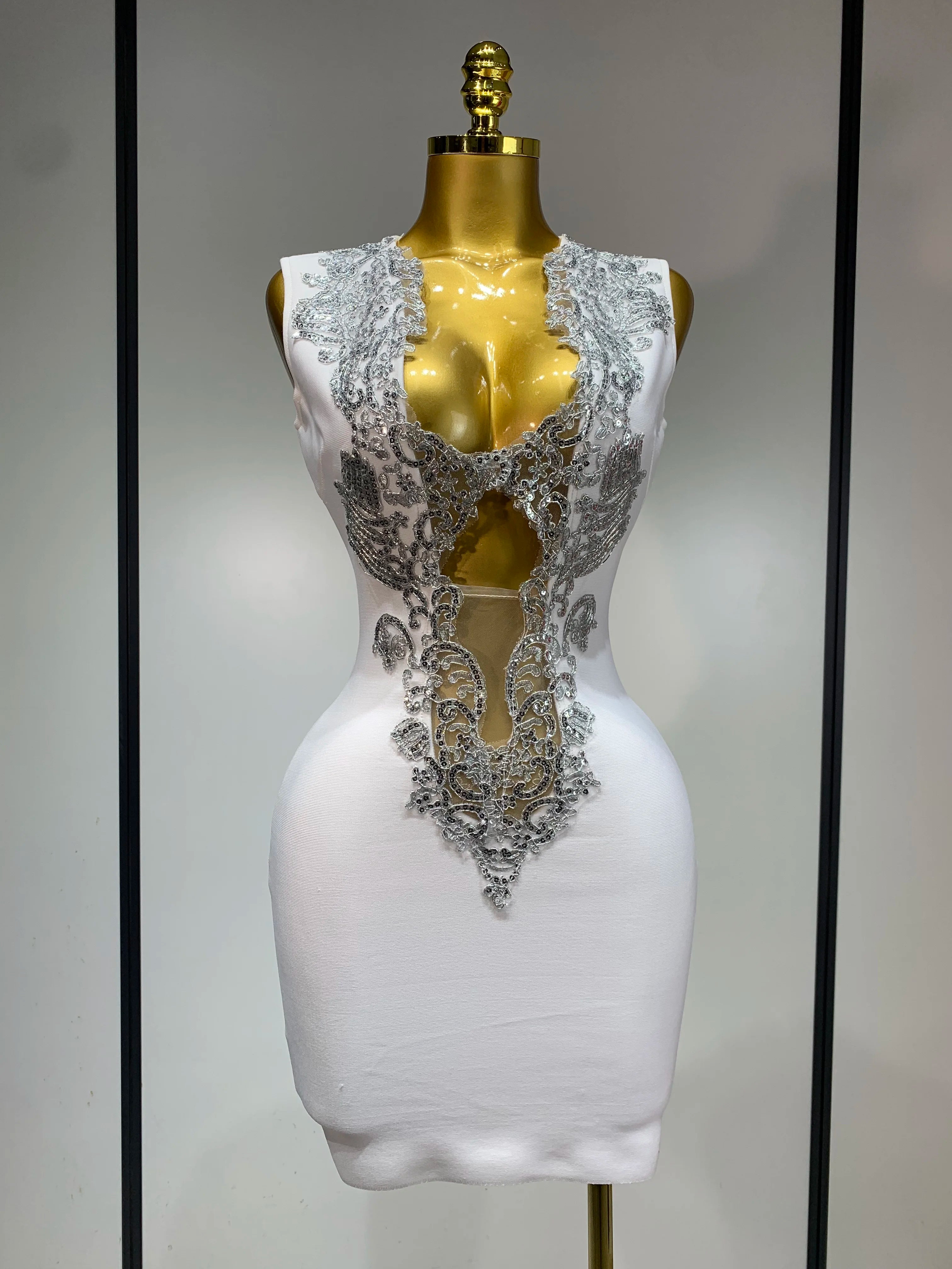 Women Sexy V Neck Cut Out Short Bandage Dress Silver Sequin White Elegant Luxury Birthday Party Club Wedding Vestidos