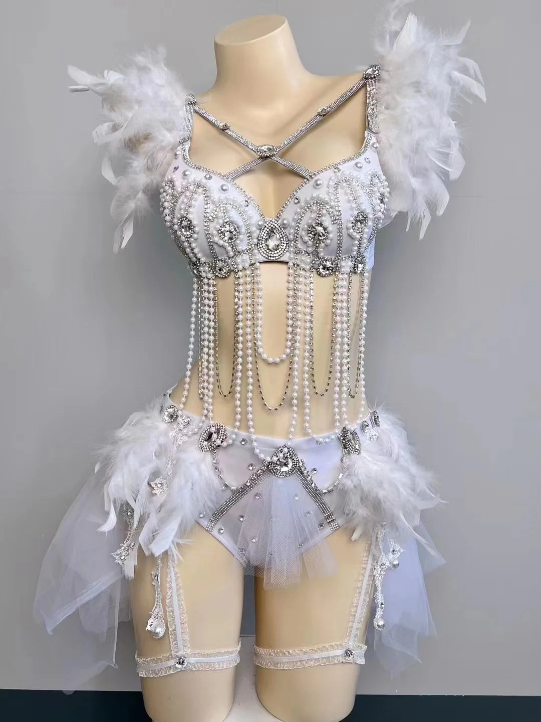 White Feather Pearl Heavy Industry Luxury Tassel Hanging Chain Rave Outfit Women Singer Bar Nightclub Party Stage Dance Costume