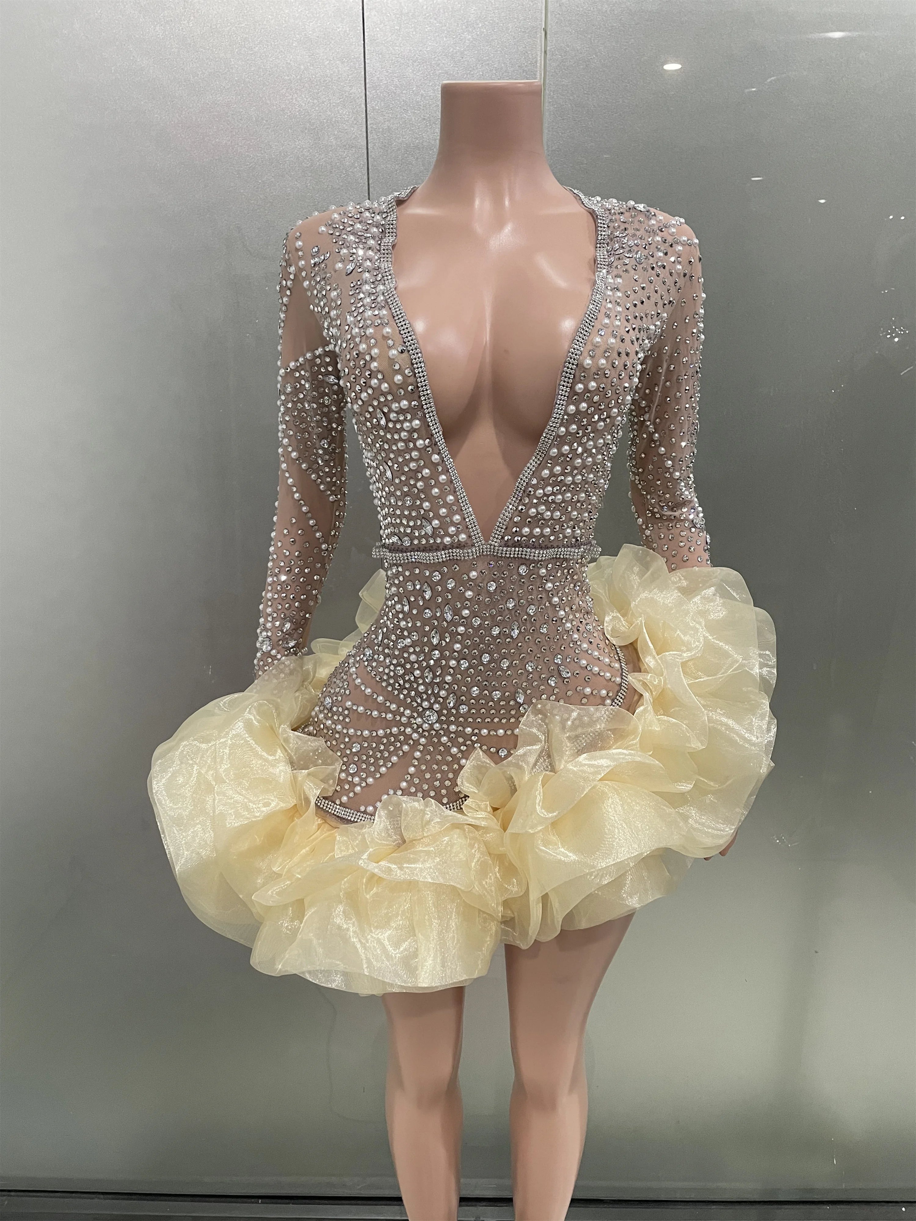 Luxury Sexy Deep V Mesh Perspective Pearl Crystal Diamond Long Sleeve Dress Women Elegant Club Dinner Birthday Party Clothing