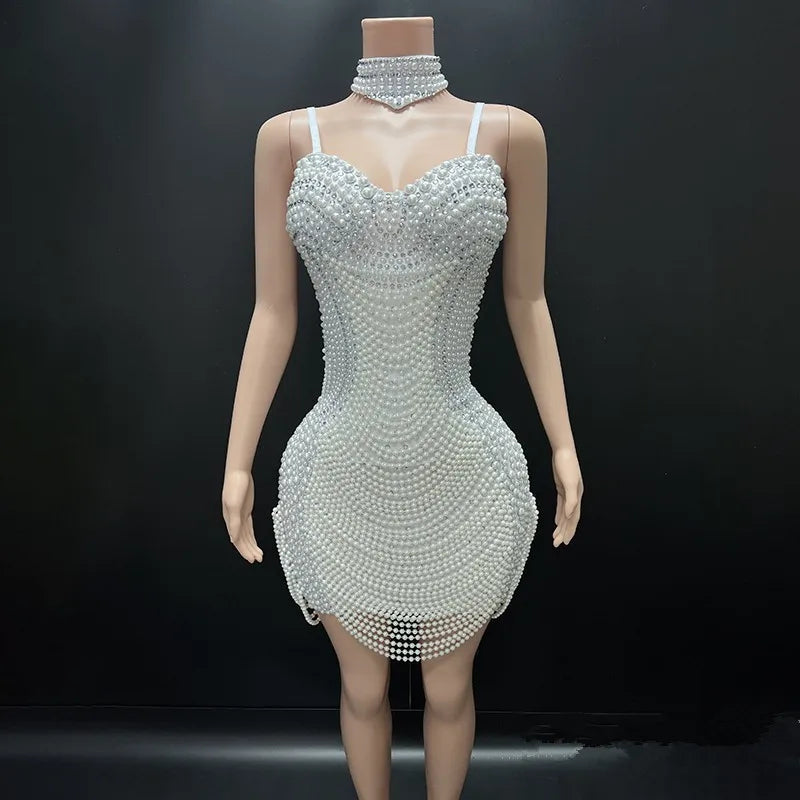 Women Luxury Pearls Studded Diamonds Beading Sparky Bodycon Mini Dress with Chocker Celebrity Evening Club Party Shinny Dresses