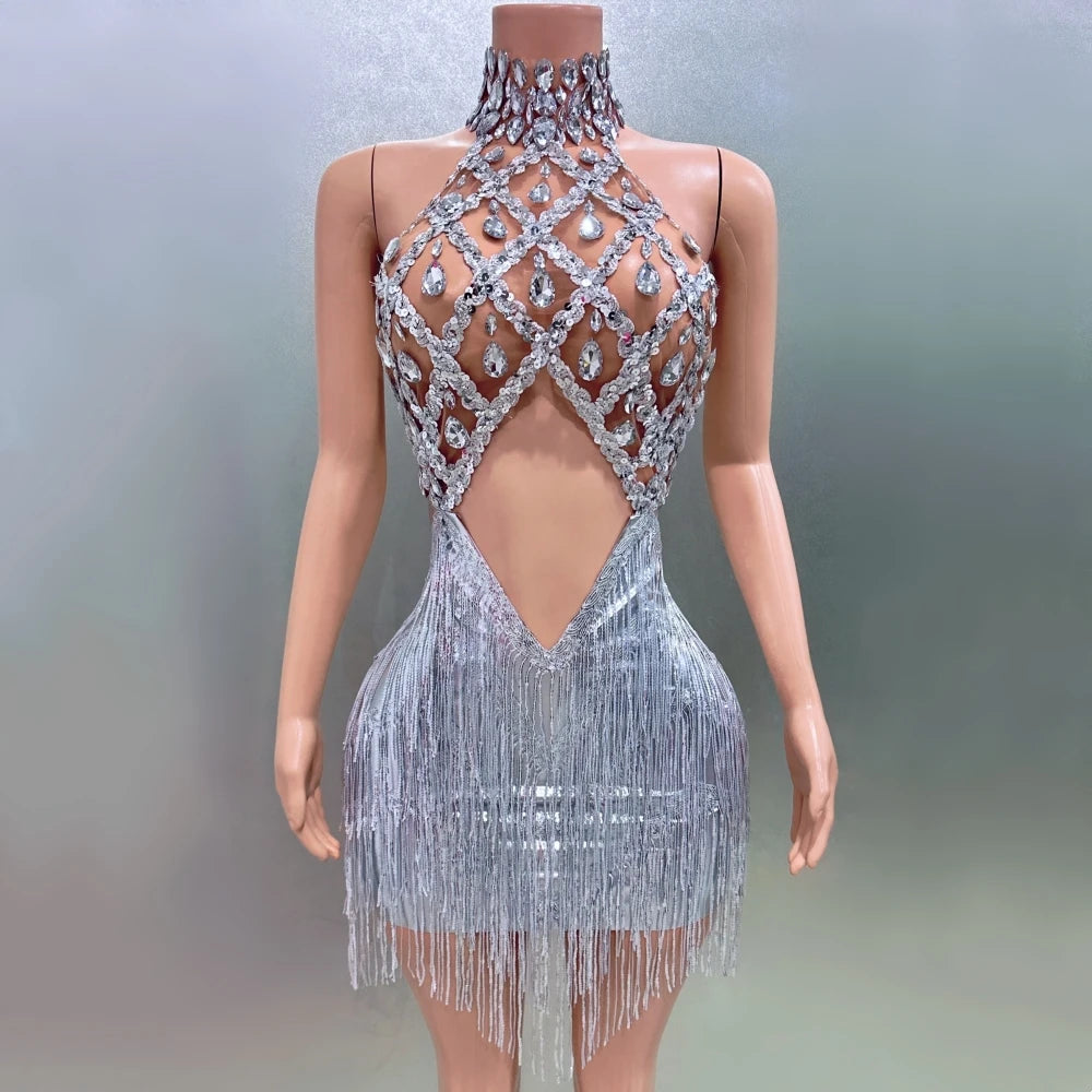 Sliver Color Rhinestones Tassels Women Sexy Halter Backless Mini Dress See Through Sexy Nightclub Party Celebrate Birthday Dress