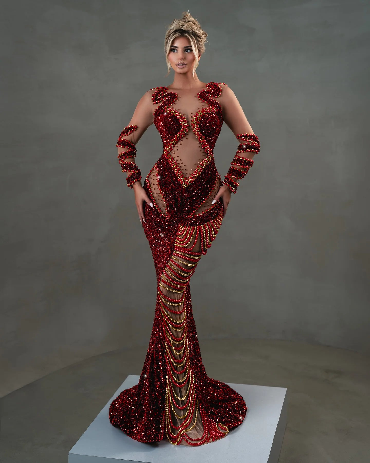Women Luxury Shiny Red Sequins Pearl Chain See Through Sexy Mesh Long Dress Evening Birthday CelebrateParty Elegance Prom Outfit