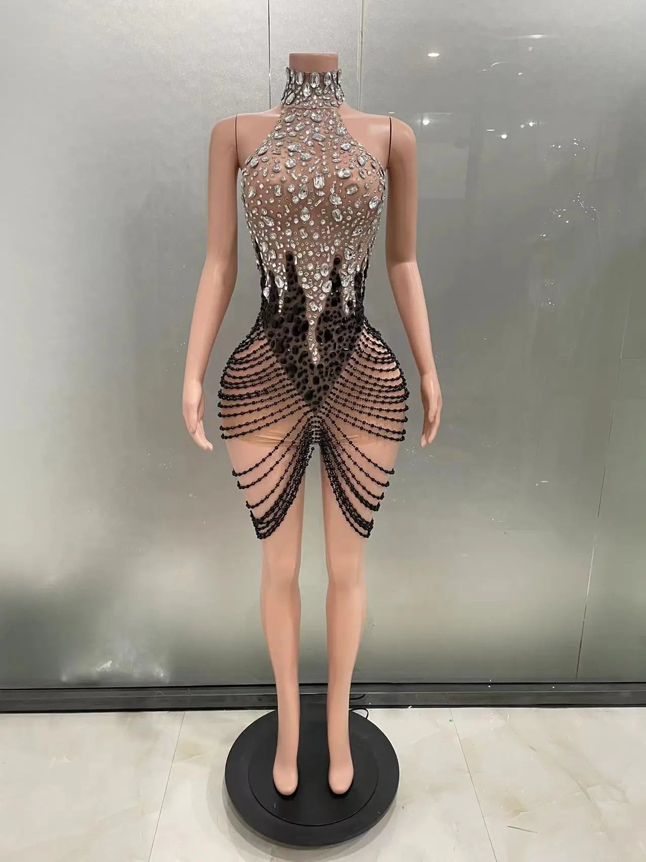 New Design Women Luxury Sparkly Rhinestones Chain Short Dress Sexy Mesh Stage Celebrate Evening Birhthday Party Photo Costume