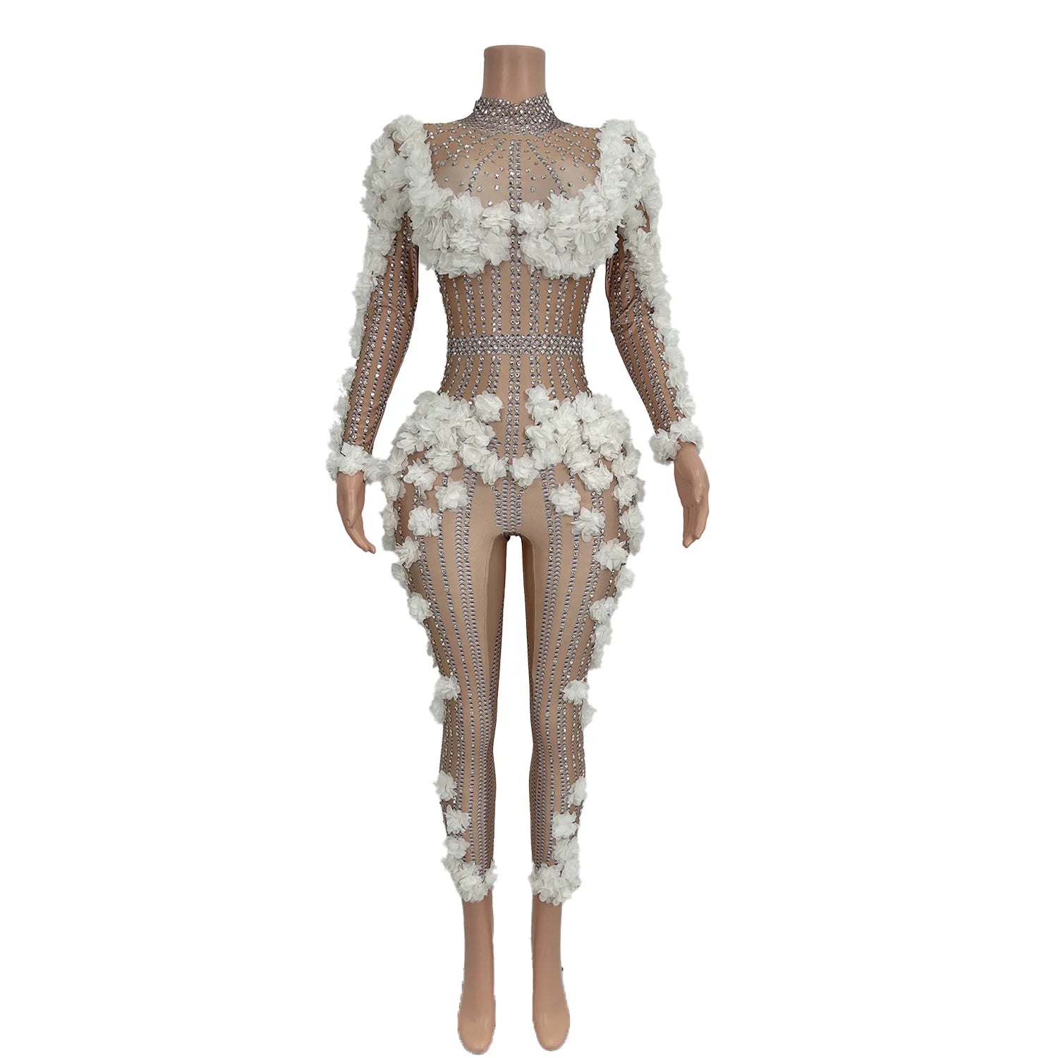 Fashion White Flowers Diamonds Jumpsuit Women Club Bodycon One Piece Playsuits Stage Costume Singer Performance Wear