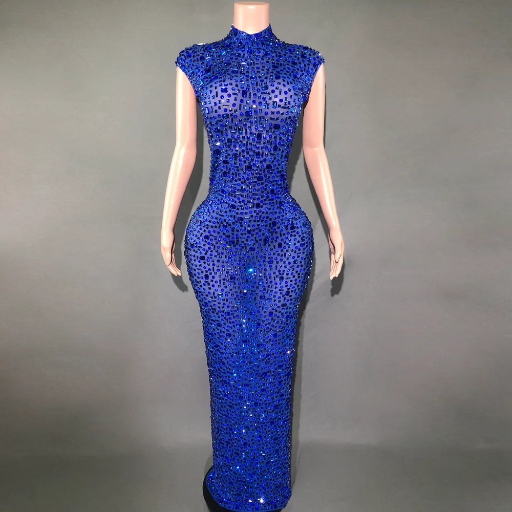 Luxurious Blue Rhinestones Long Dress for Women Sexy Mesh Celebrate Evening Prom Birthday Dress Photo Shoot Singer Show Wear