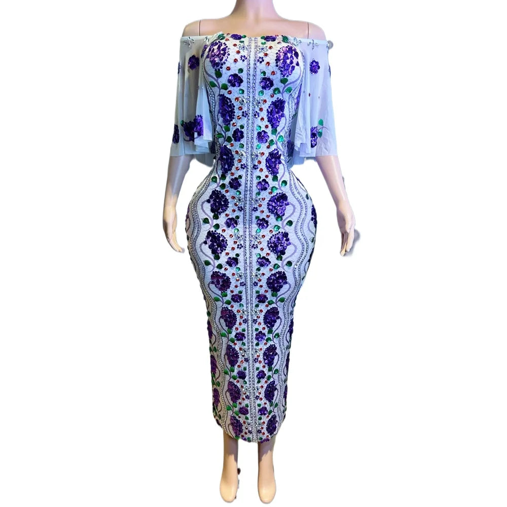 Sexy Mesh See Through Off-shoulder Celebrate Evening Birthday Dress for Women Elegant Rhinestones Sequins Photo Shoot Wear