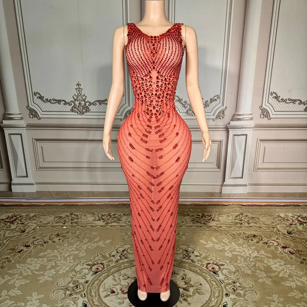 Sparkly Red Rhinestones Long Dress for Women Sexy Sleeveless Mesh See Through Celebrate Evening Birthday Dress Photo Shoot Wear
