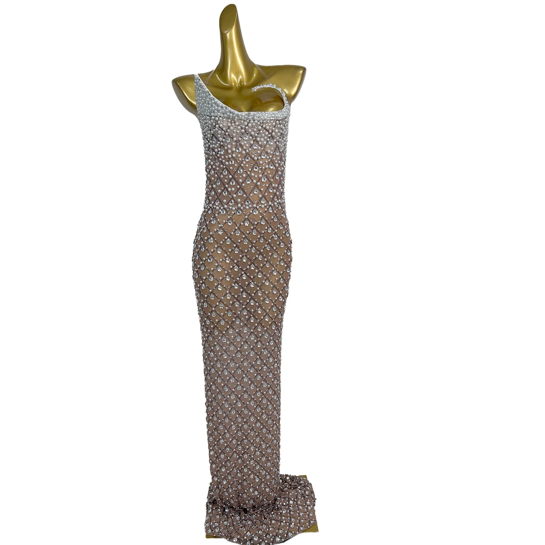 Women Luxury Sparkly Crystals Pearls Evening Gown Club Event Show Birthday Celebrate Elegant Long Dresses Party Outfit