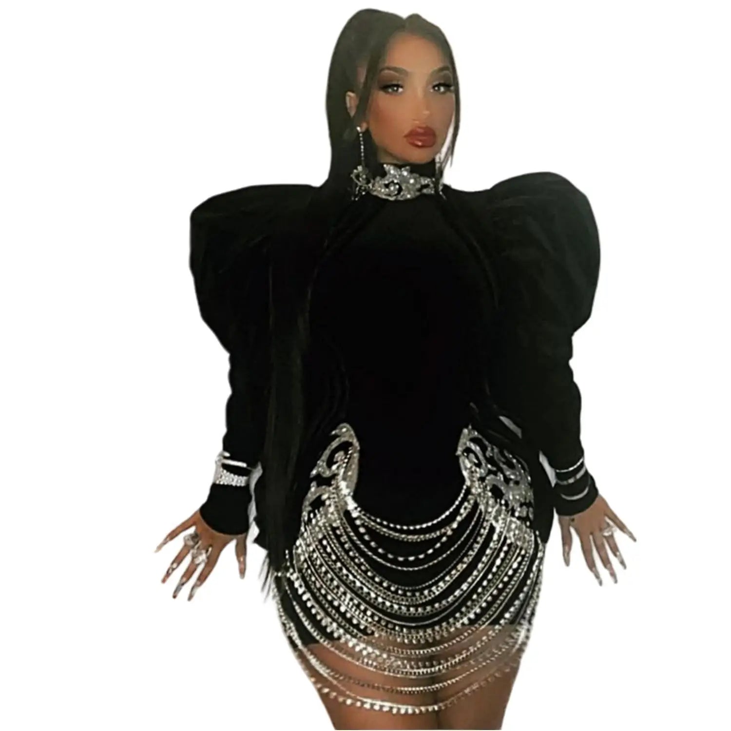 Black Drill Chain Fringed Diamonds Dress Women Party Jazz Dance Rave Outfit Gogo Costumes Stage Performance Clubwear