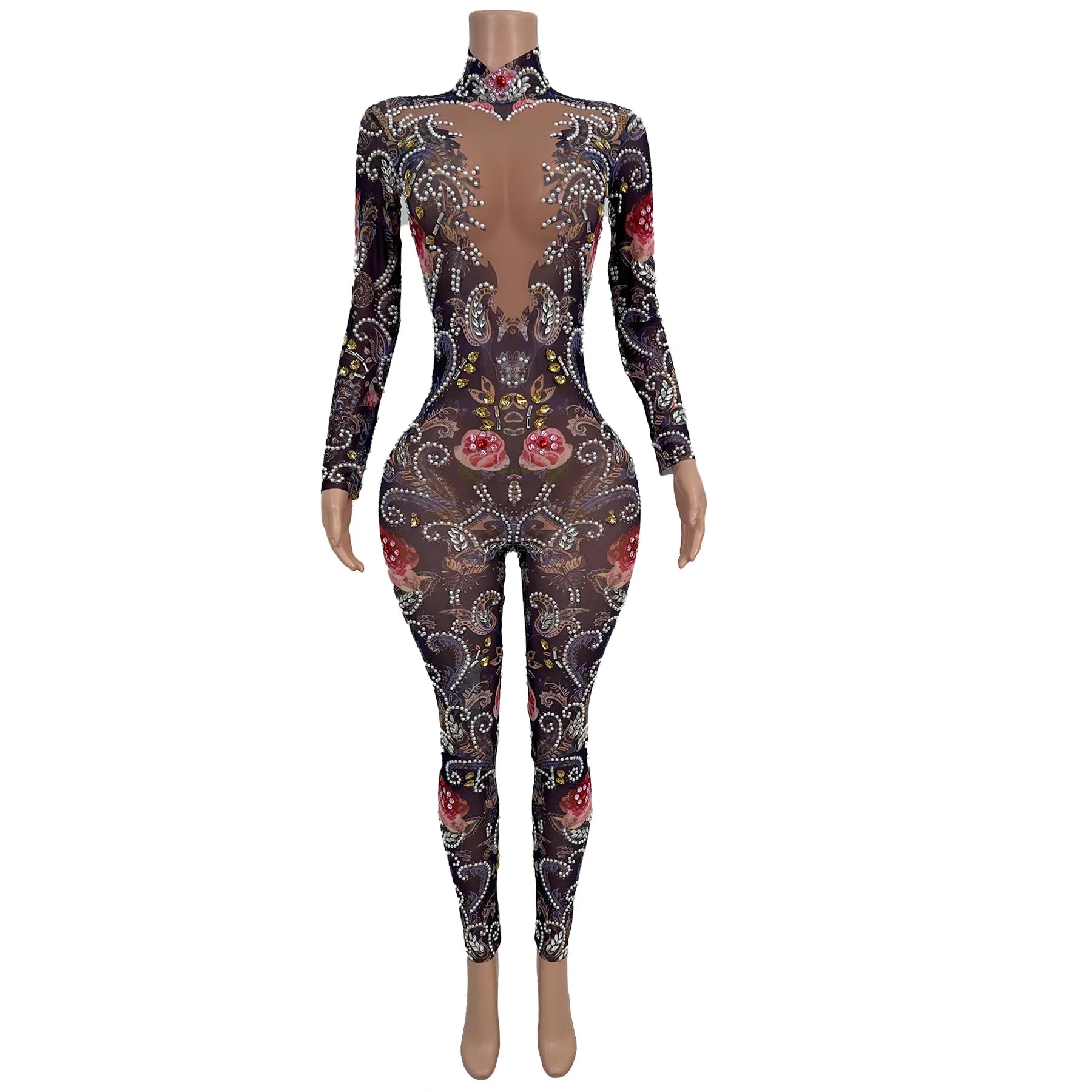 High-end Pearls Rose Printing Mesh Outfit Club Celebrate Party Dance Tight Fitting Jumpsuit Stage Drag Queen Show Wear