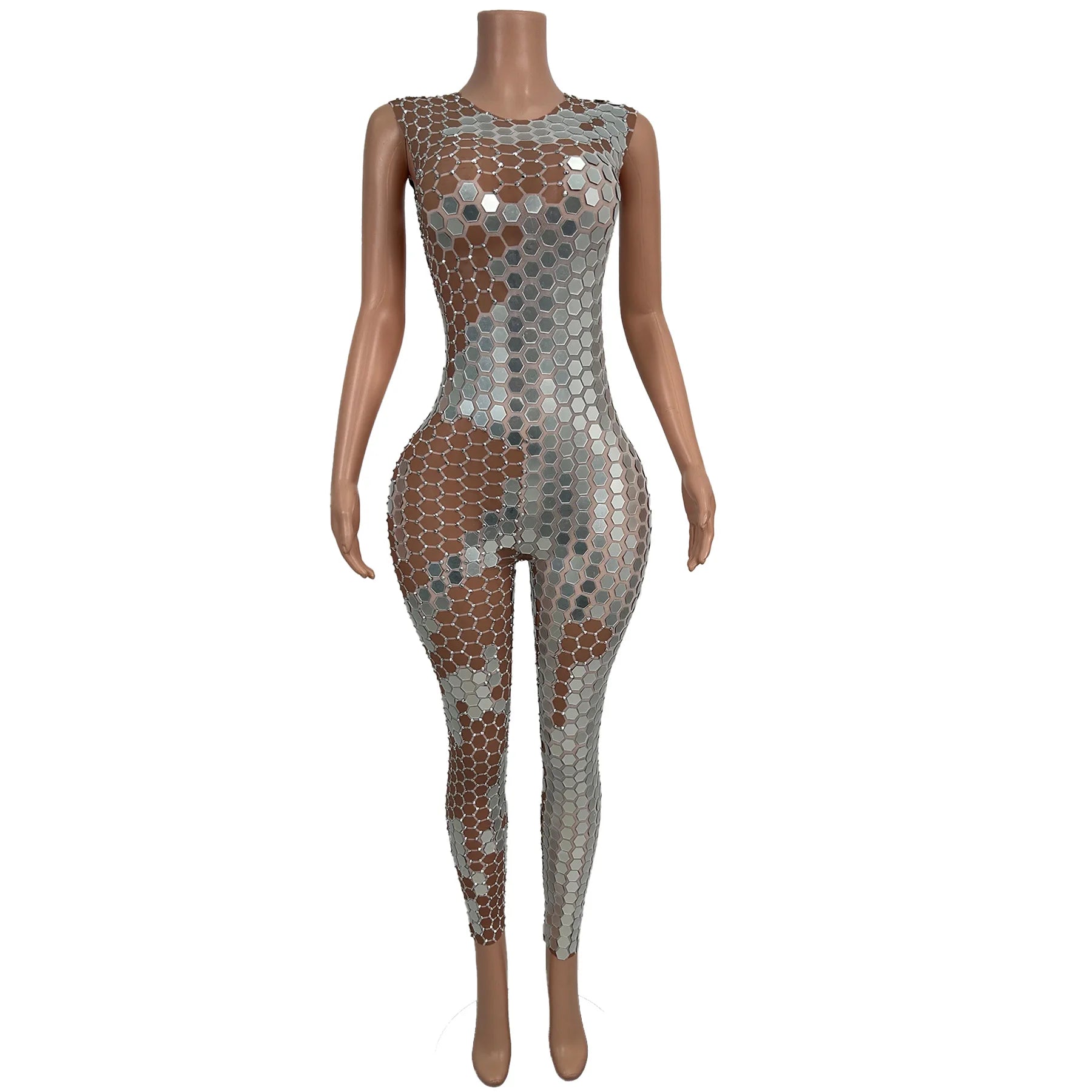 Sparkly Rhinestone Mirrors Sleeveless Bodycon Jumpsuit Celebrate Party Stage Performance Wear Sexy Showgirl Dance Wear
