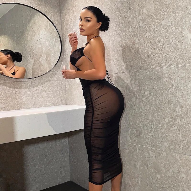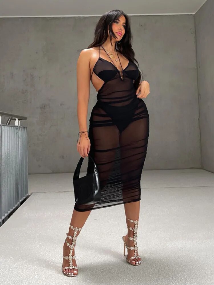 Black See Through Midi Dress Mesh Halter Sleeveless Backless Dress Bandage Sexy Slim Summer Beach Outfits
