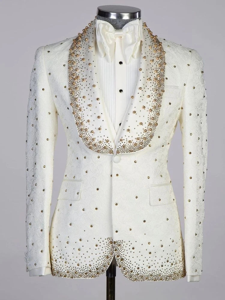 This 2-piece men's suit includes a blazer and vest adorned with diamonds, beads, and appliques. The one-button blazer features a wide lapel, perfect for formal events like parties, weddings, and groom attire. Tailored to perfection and available in plus sizes, this ensemble exudes style and sophistication, making it an ideal choice for any special occasion. Elevate your look with this meticulously crafted and stylish suit.