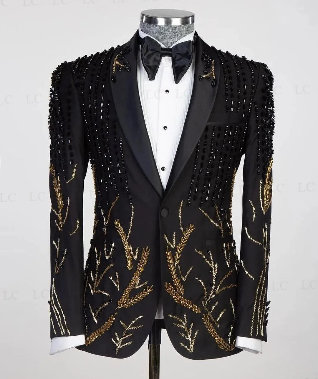 Elevate your style with this luxurious 2-piece men's suit featuring crystals, beads, and intricate embroidery. The set includes a sophisticated blazer and pants adorned with dazzling diamonds for a touch of opulence. The one-button design adds a modern and sleek touch, perfect for weddings, prom, or special events. Tailored for a plus-size fit, this costume homme exudes luxury and charm, making it an ideal choice for grooms and formal occasions.