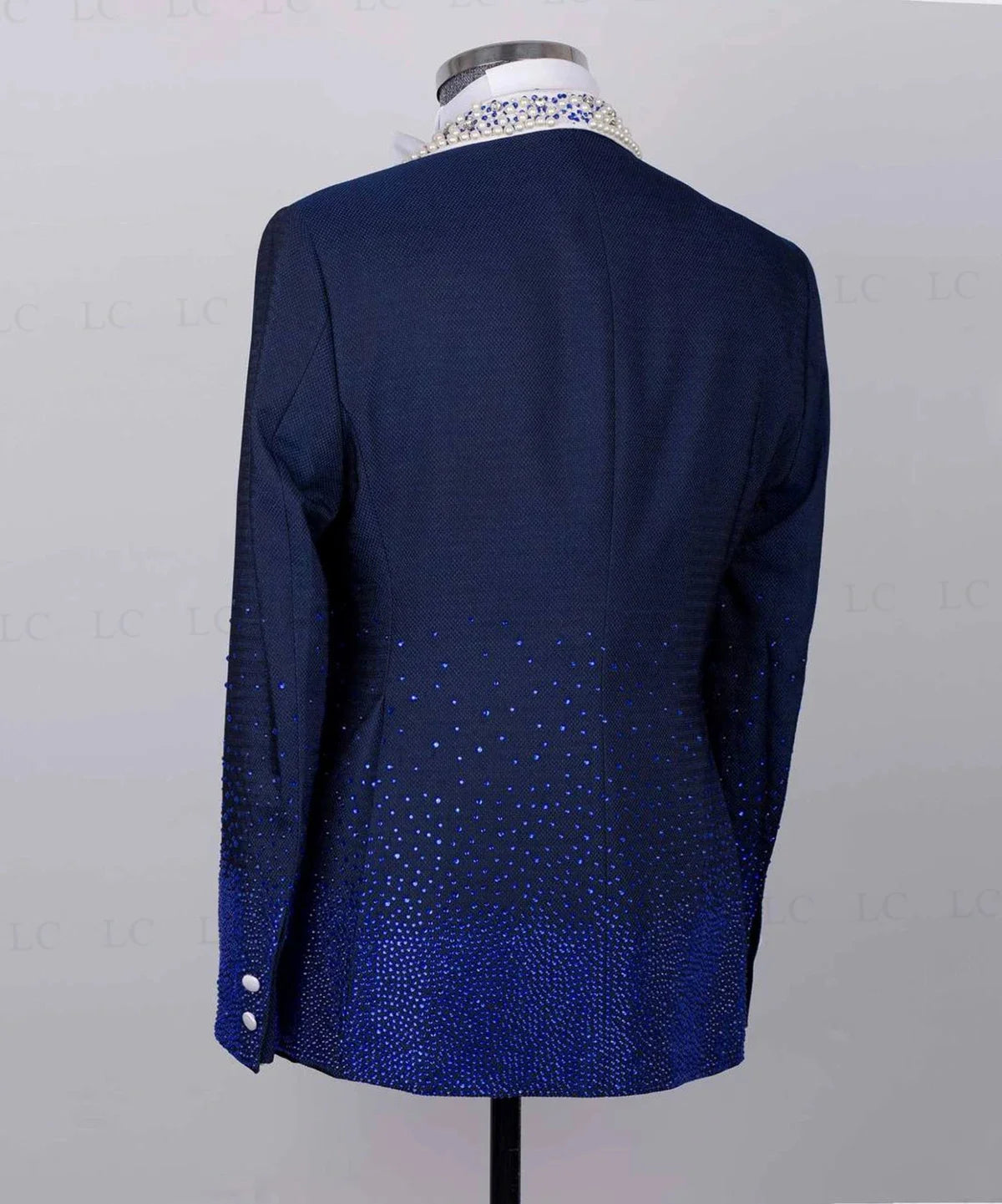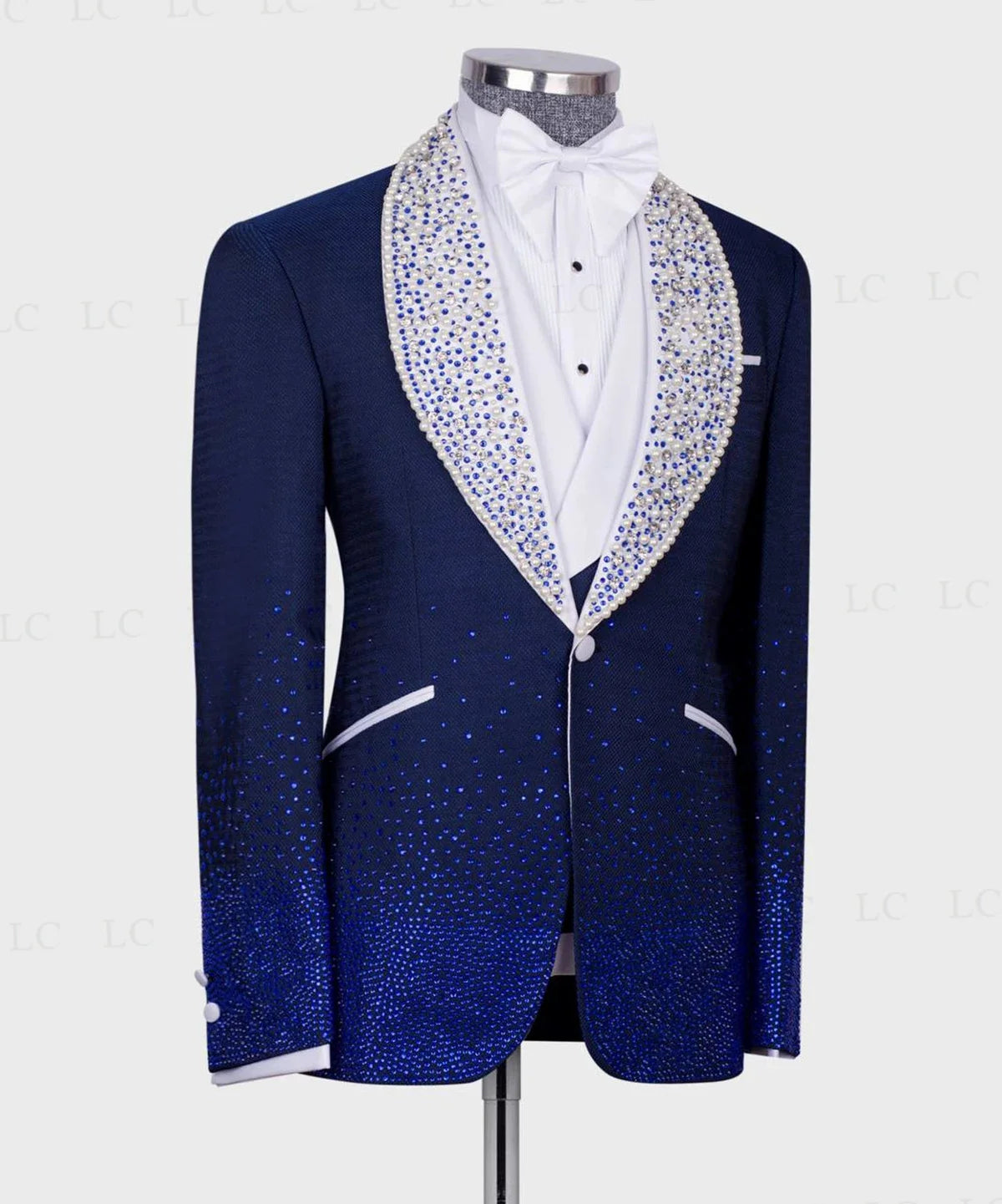 Step into luxury with this 2-piece men's suit adorned with crystals, diamonds, and beaded detailing. The set includes a stunning blazer and vest, both embellished with intricate pearls for a touch of elegance. The one-button design adds a modern touch to this prom and wedding attire, perfect for a groom or special occasion. Available in plus sizes, this costume homme exudes sophistication and charm, making you stand out at any event.