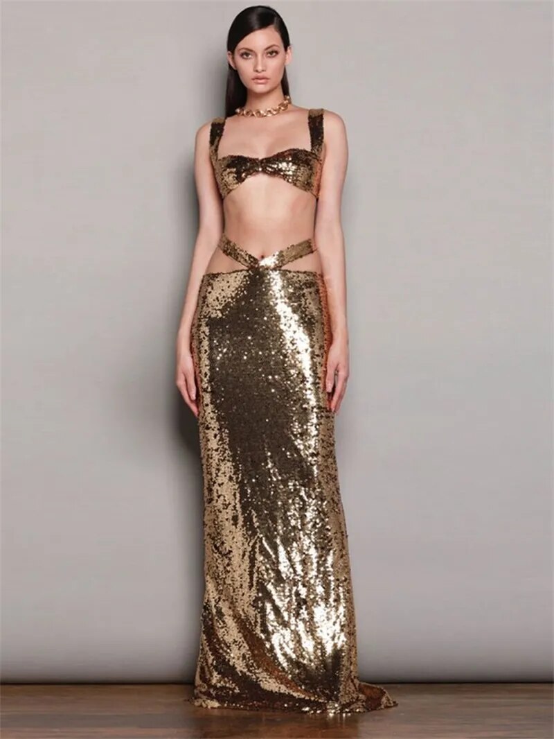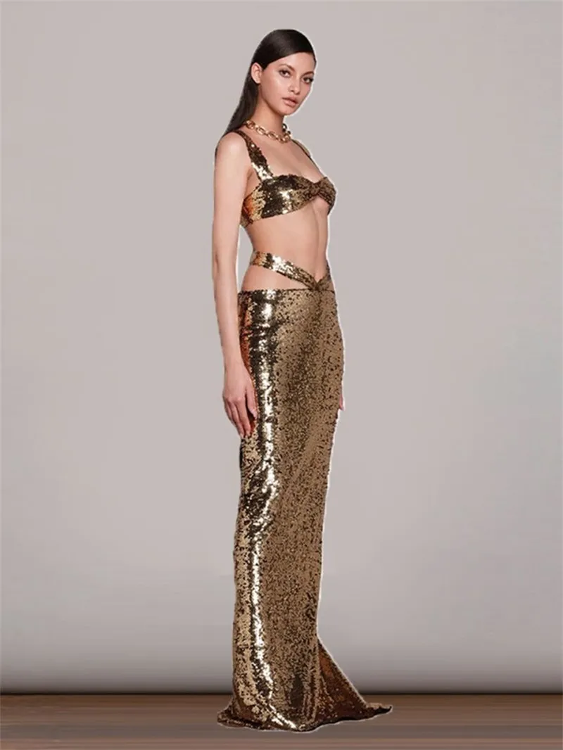 2 Pieces Golden Set Summer Evening Dress Shiny Sequins Sexy Ins Hot Girl Holiday Long Prom Party Dress Beachwear