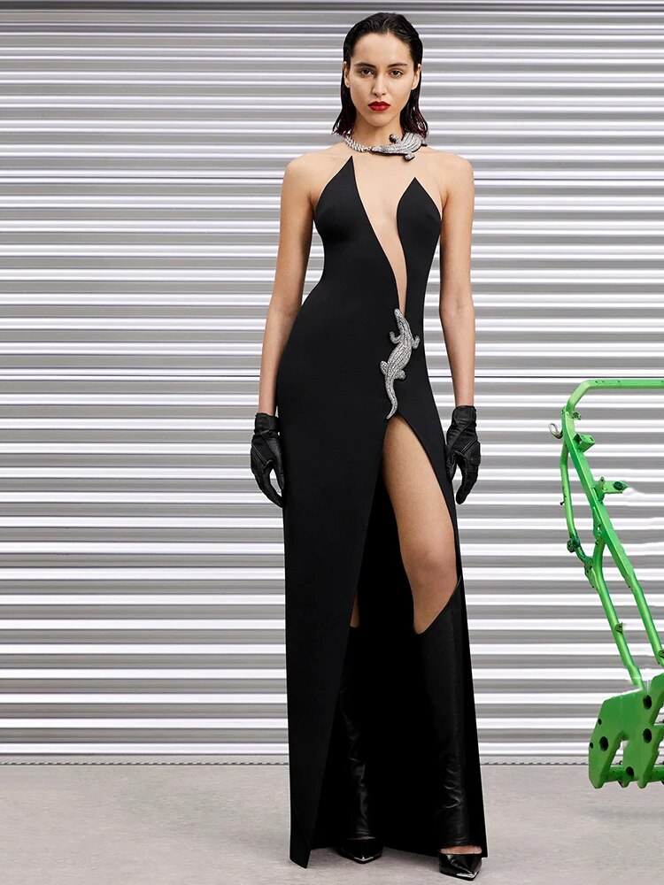 Autumn New Elegant Women's Sleeveless Mesh Stitching Shiny Diamond Black Sexy High Split Bodycon Bandage Party Dresses