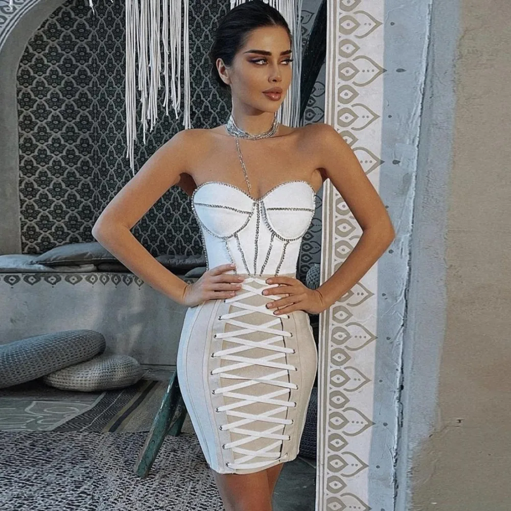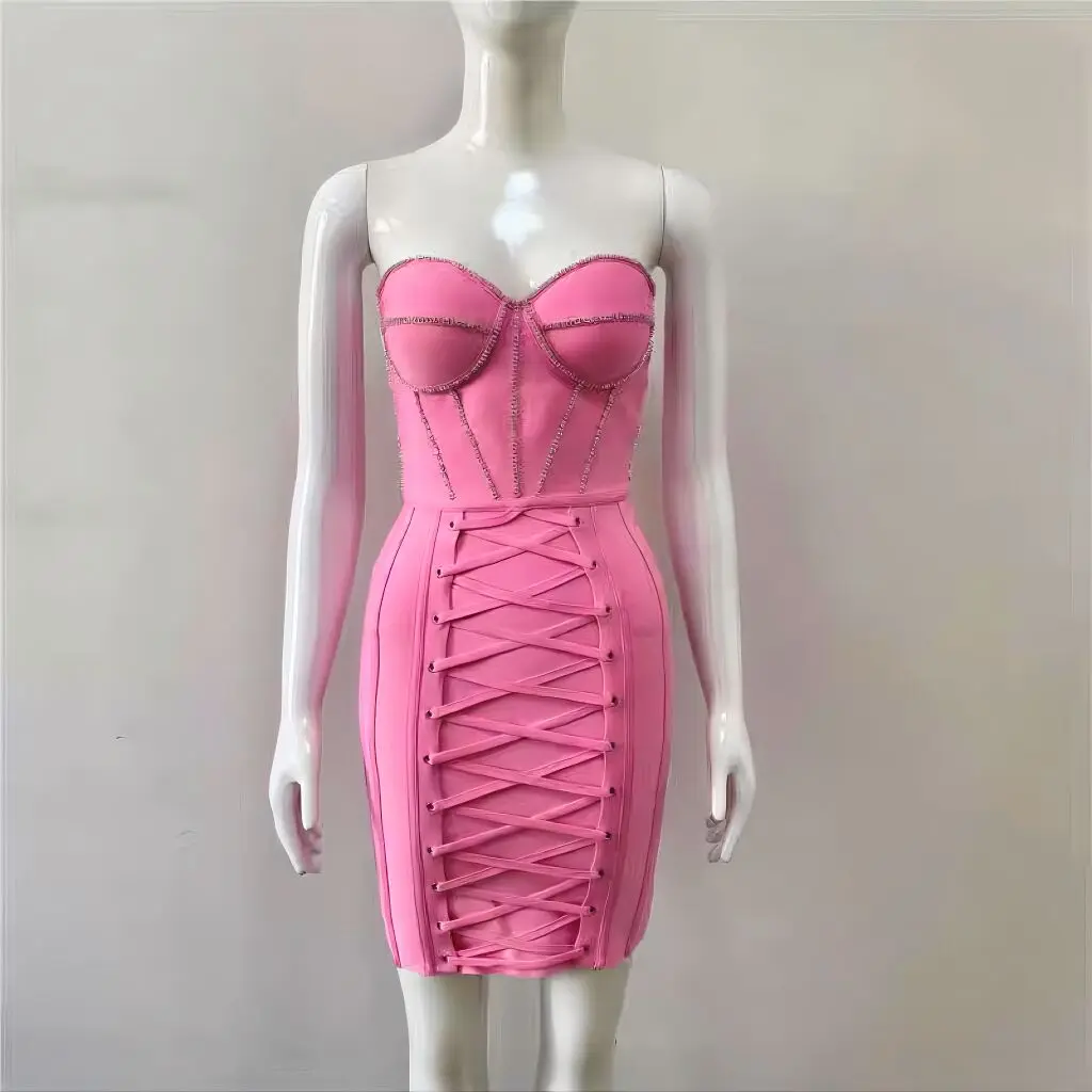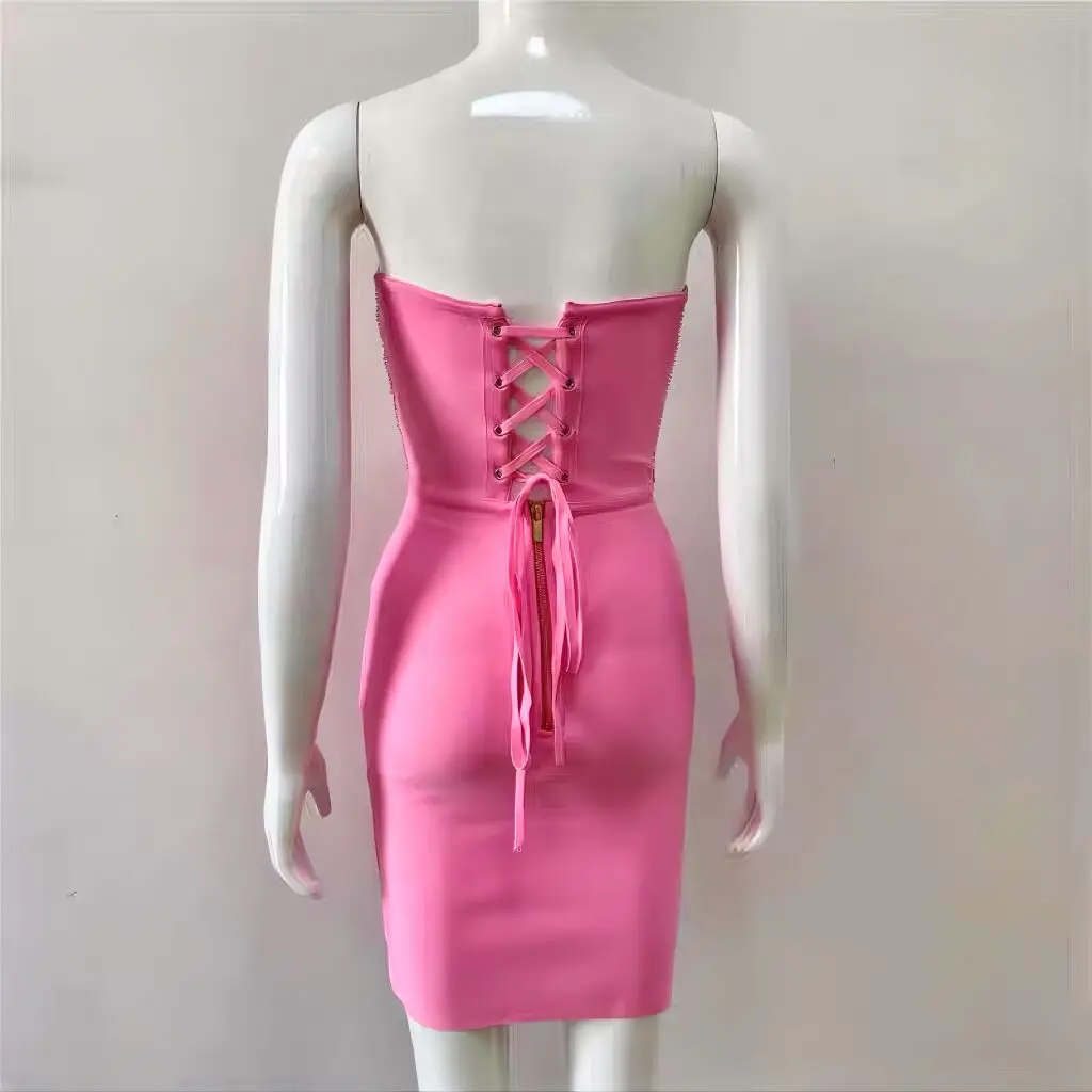 Summer Pink White Sexy Sleeveless Strapless Dress Rayon Bandage Nightclub Party Bodycon Mini Outfit Vestido