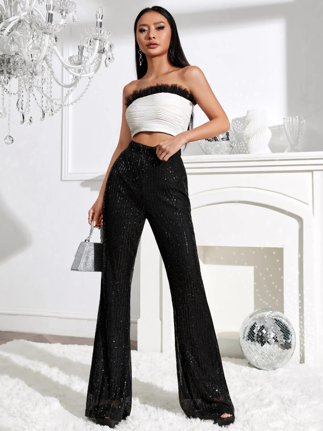 Elegant Lady Glitter High Waist Wide Leg Sequin Pants Women Bling Length Sparkling Flared Trousers Party Clubwear Black