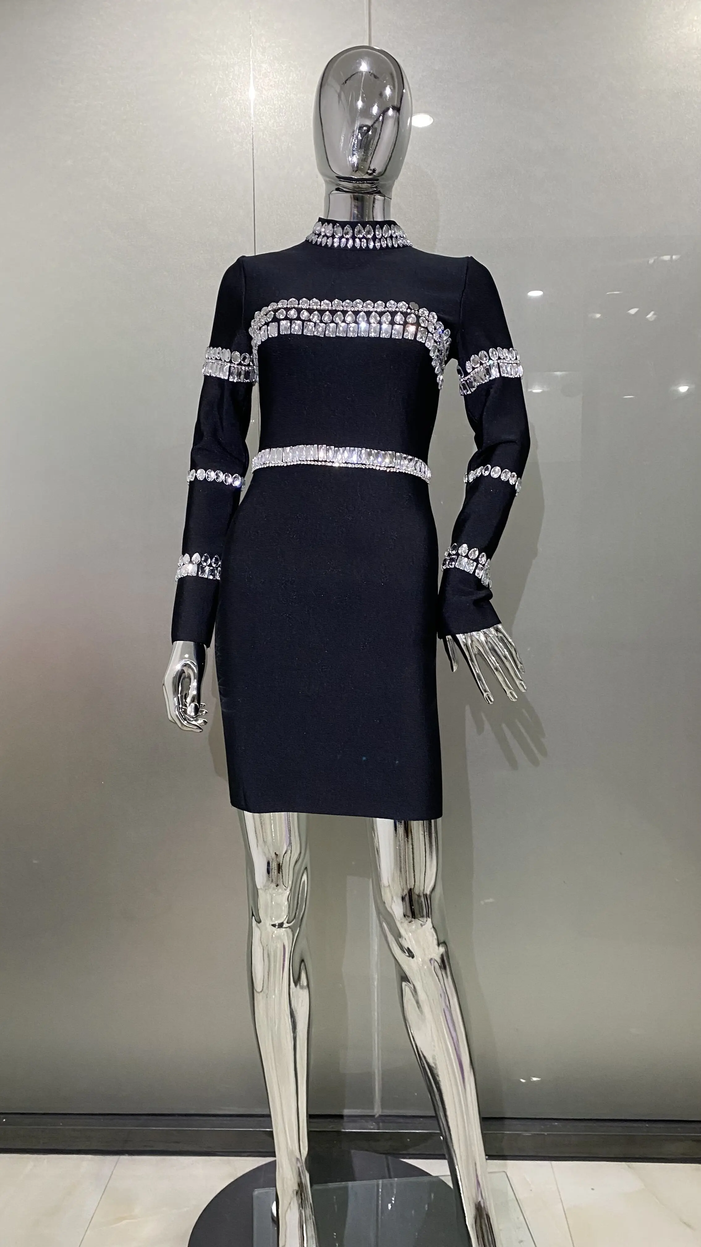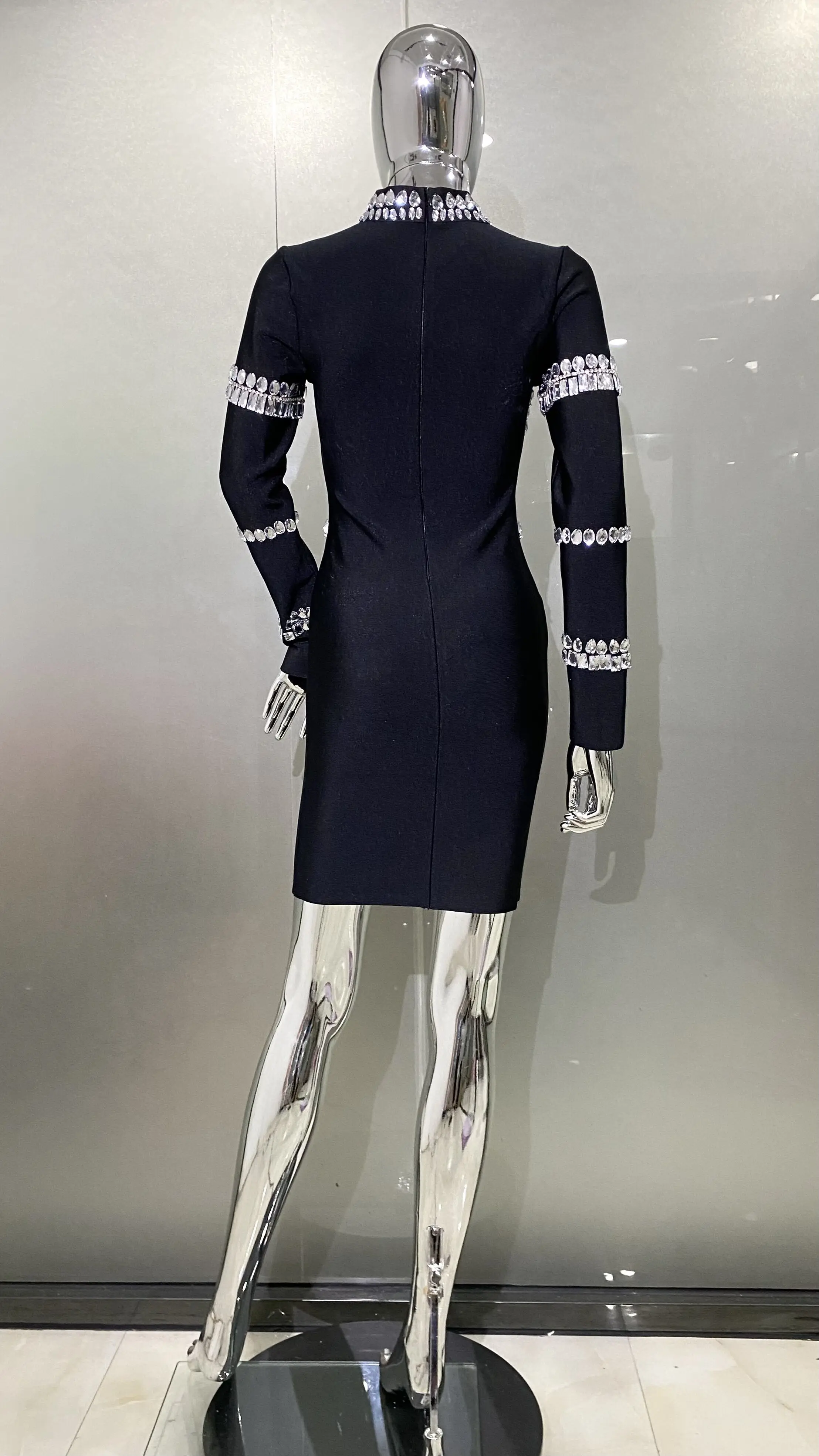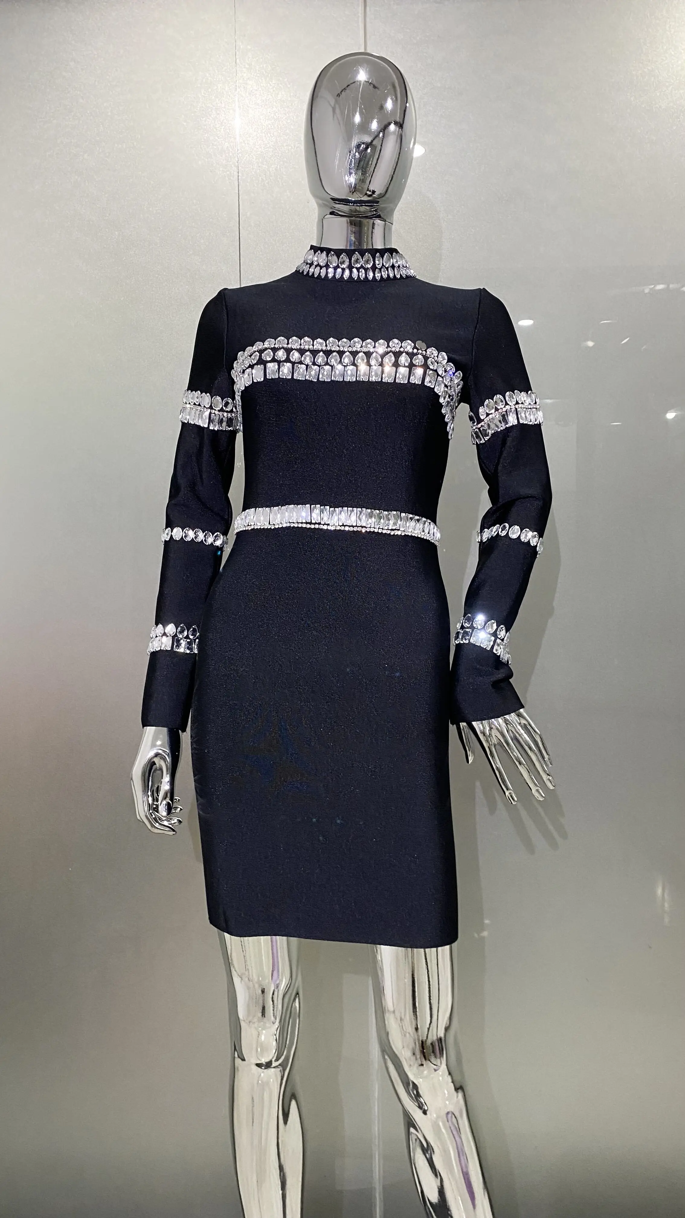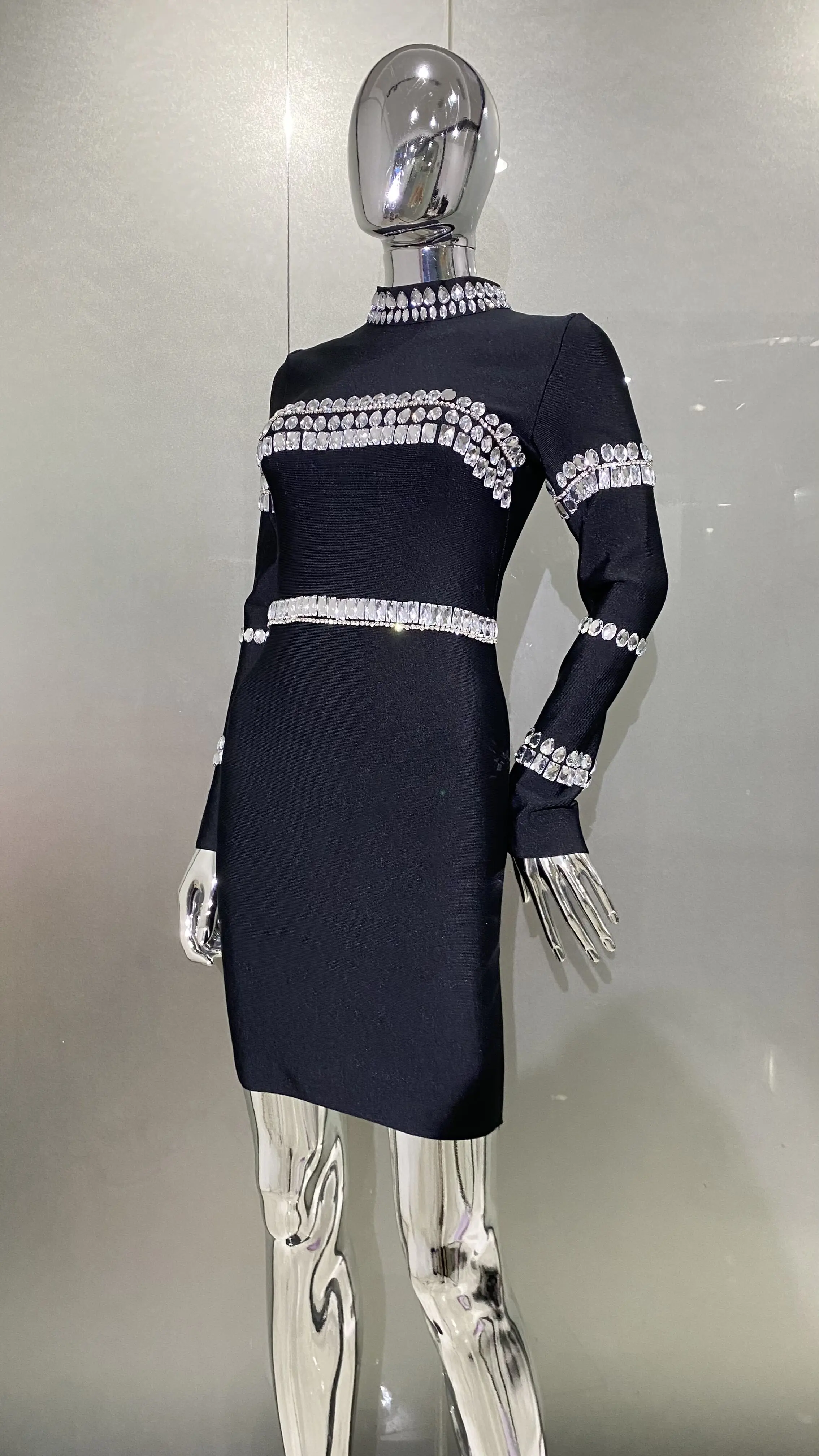 Summer Women Black Color Long Sleeve High Neck Beading Bandage Mini Bodycon Dresss Evening Party Dress