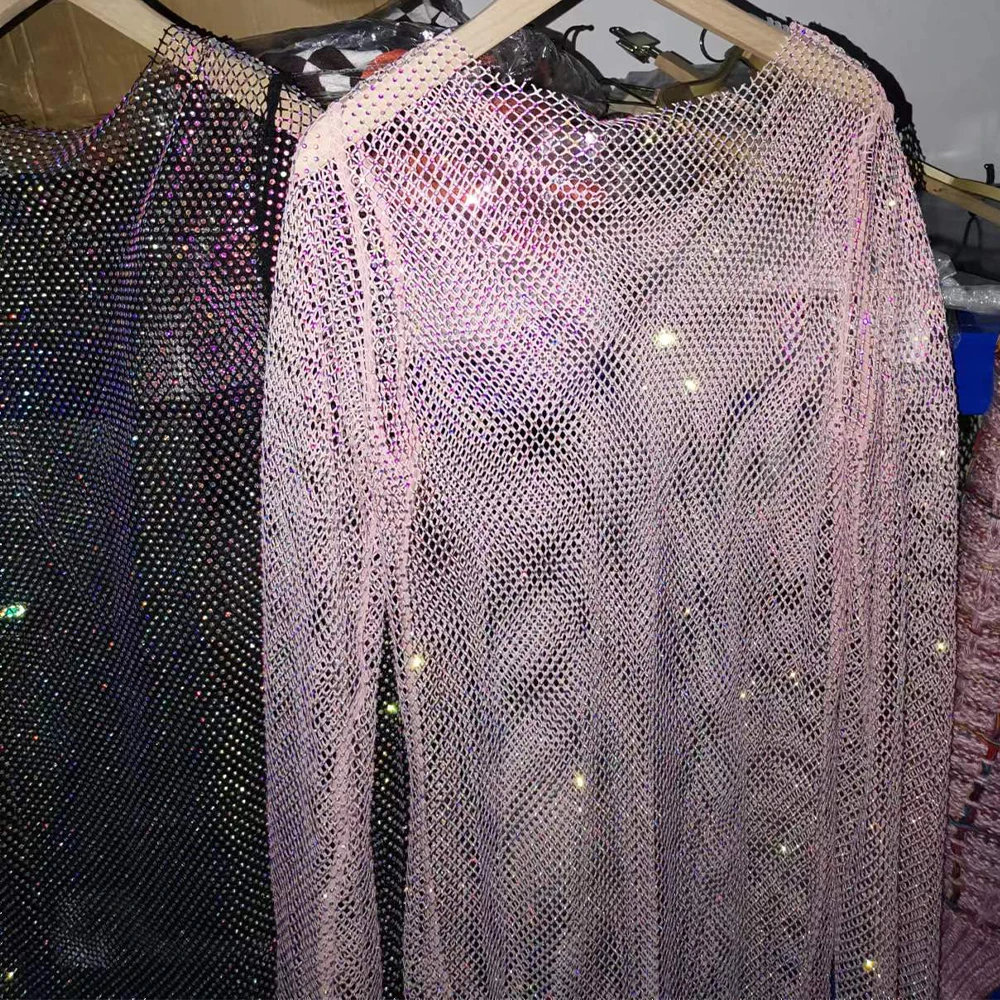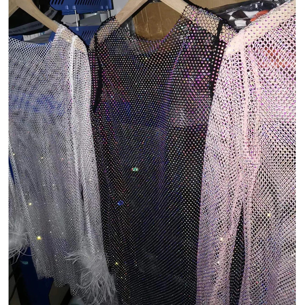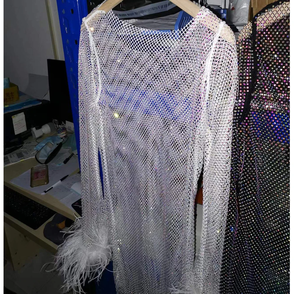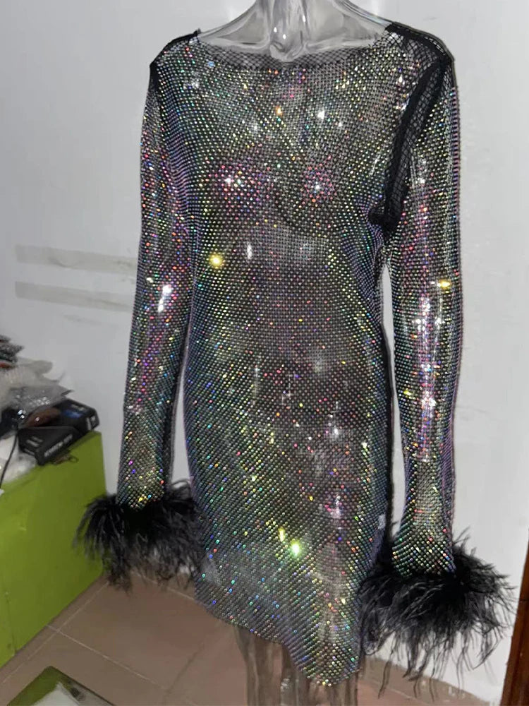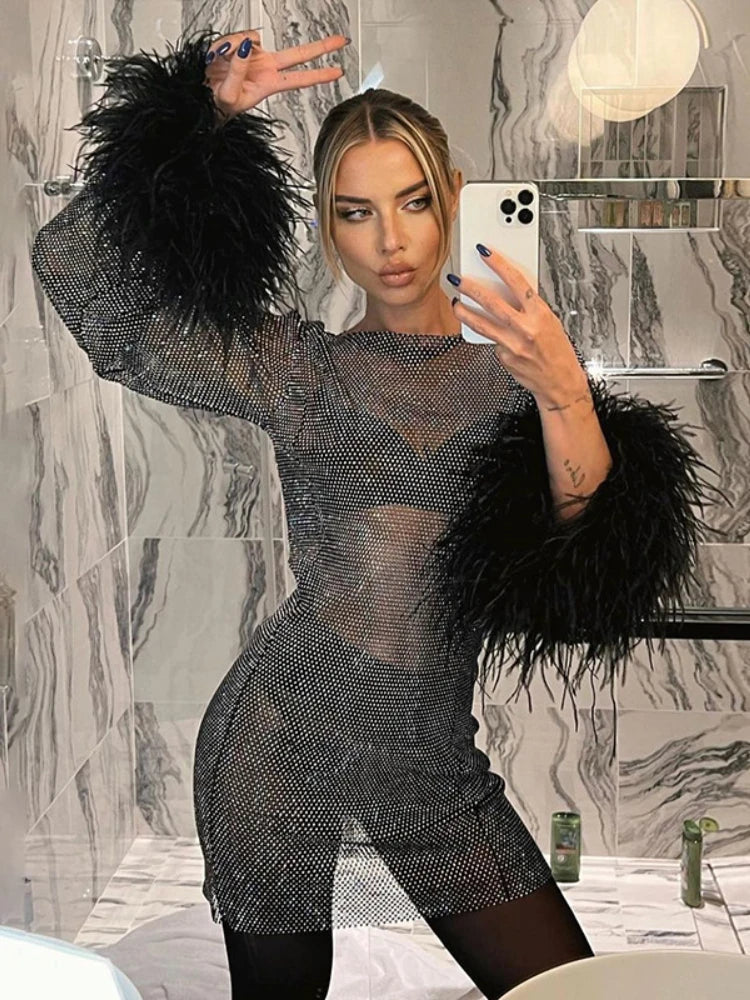 Sexy Mesh Mini Dress Women Fashion Feathers Tassel Full Sleeve See Through Dress Summer Pink Shinny Club Party Dress Outfit