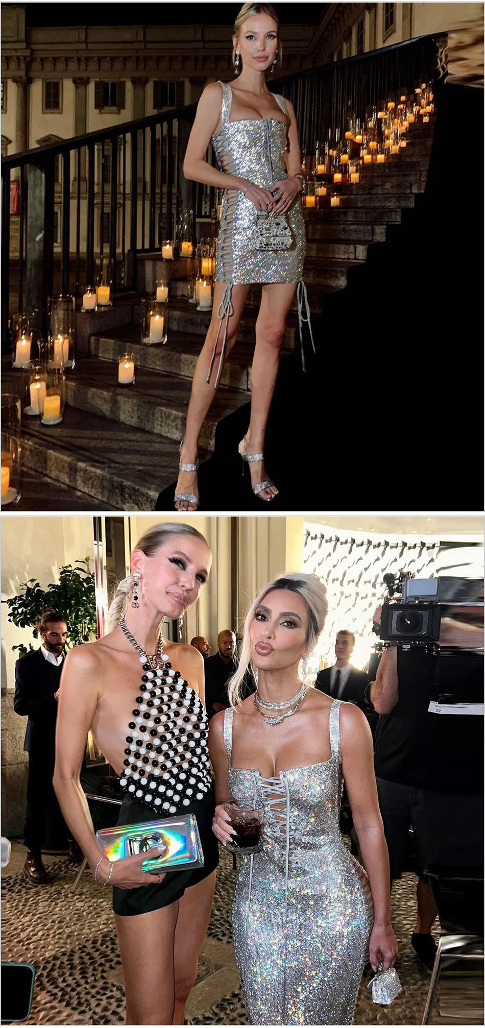 This mini dress features colorful rhinestones, a sexy sling design, lace-up detailing, and a hollow-out wrapped double strap for a stylish and alluring look.