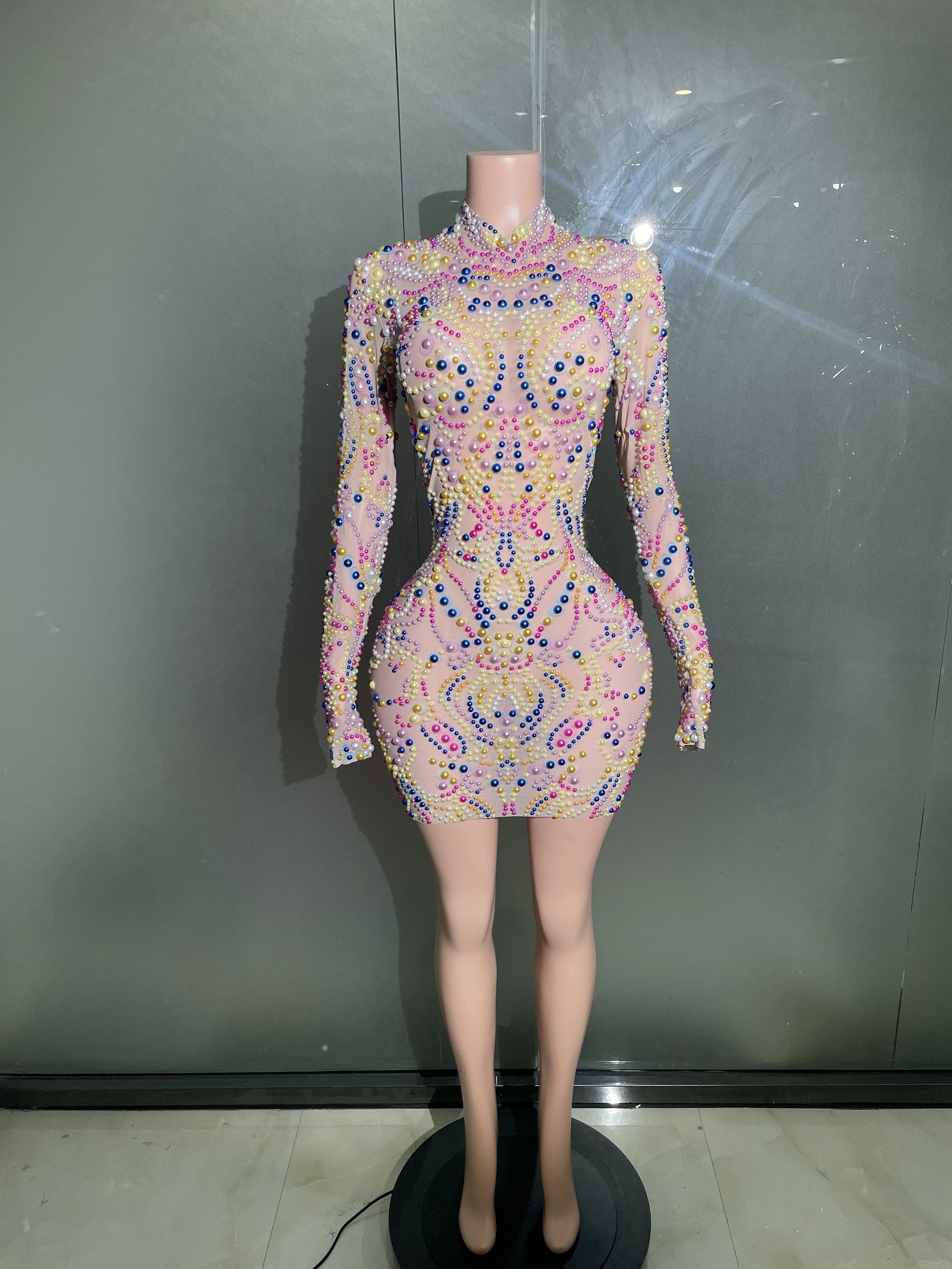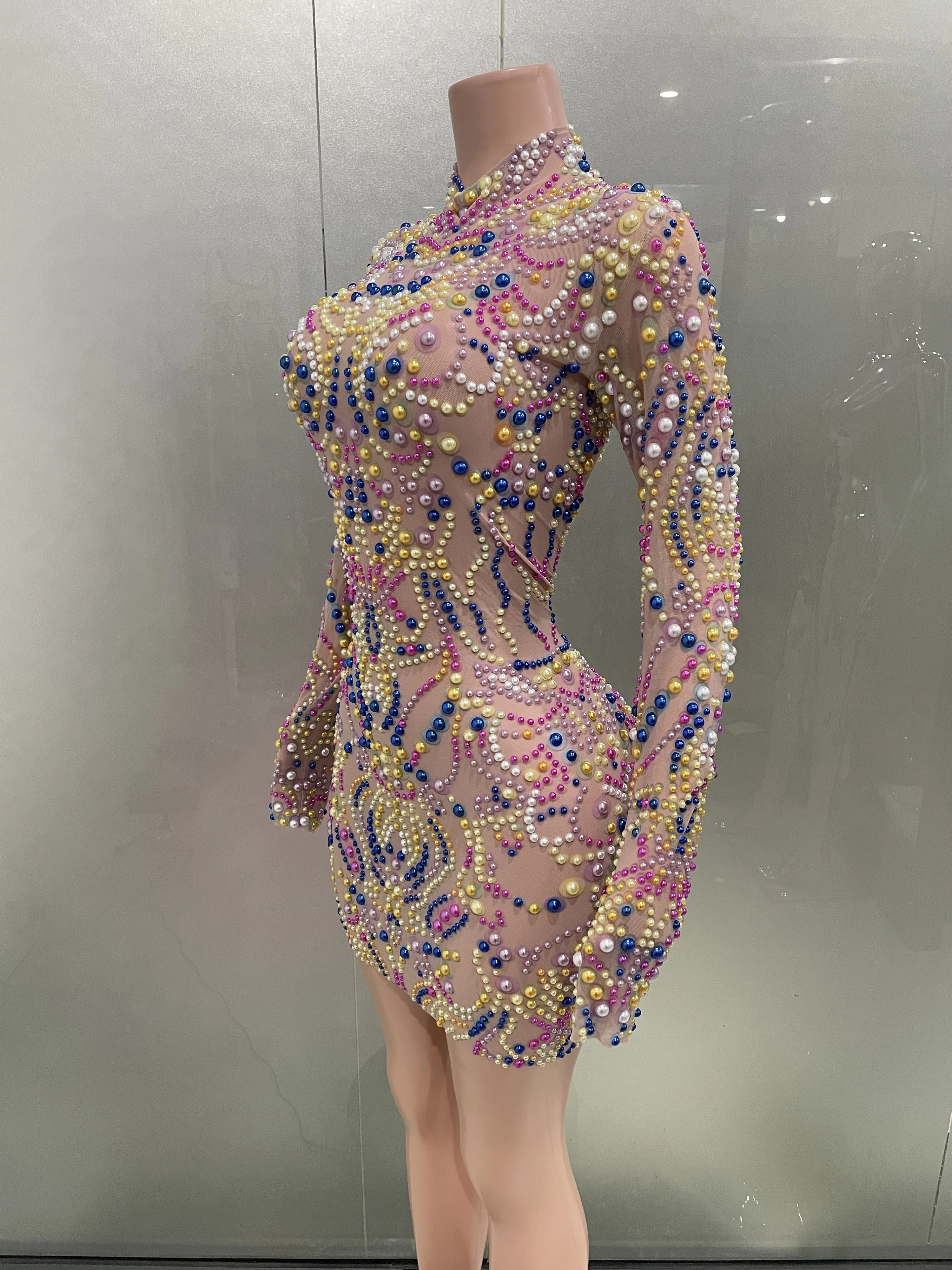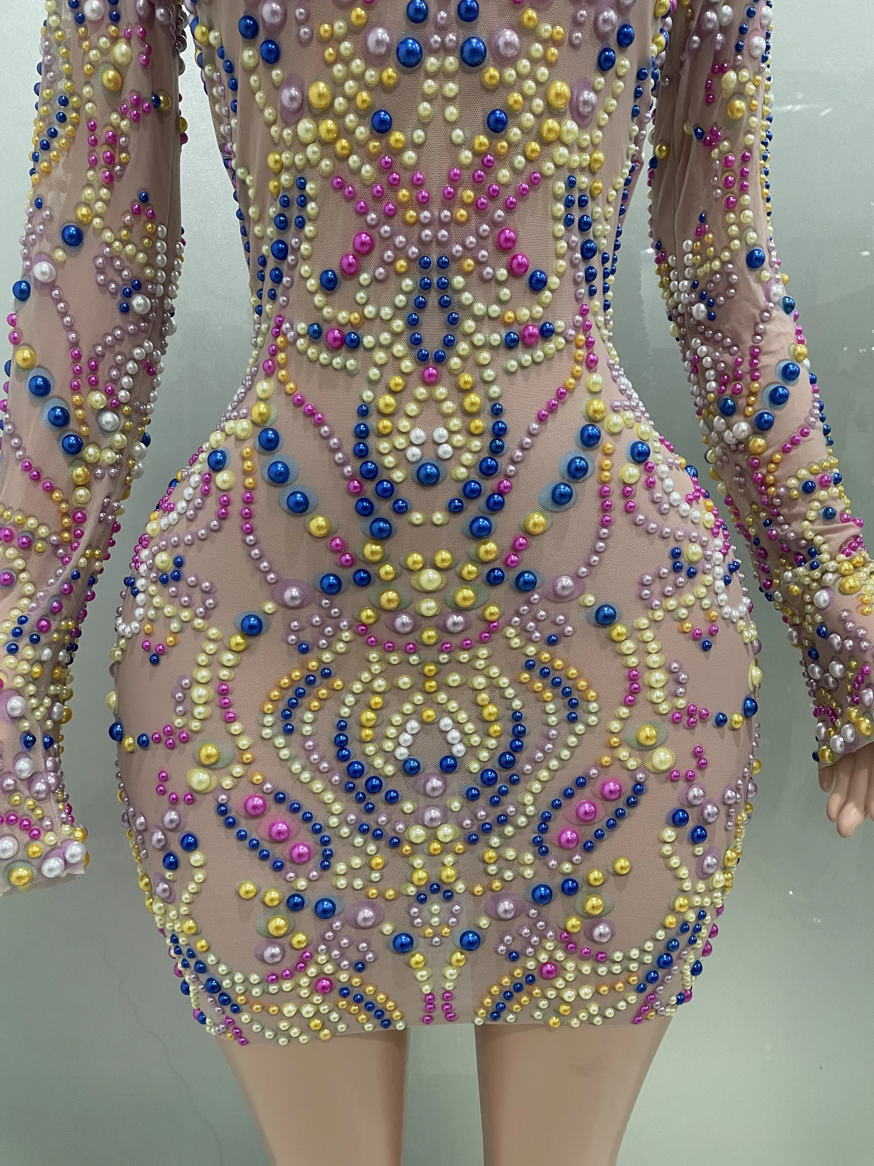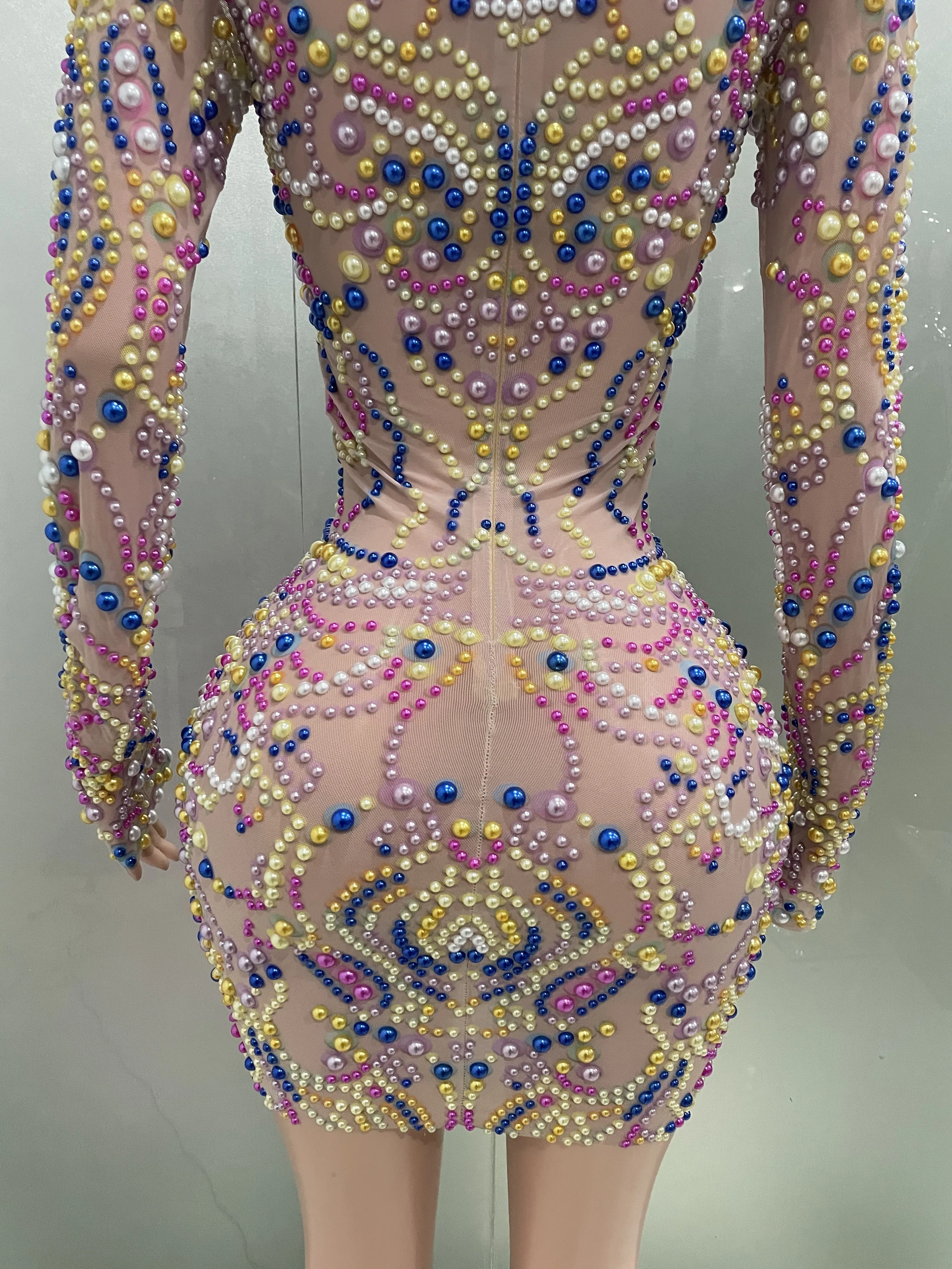 Sexy Full Colour Pearl Mesh Stretch Short Dress Women Evening Birthday Party Prom Celebrate Nightclub Stage Costume